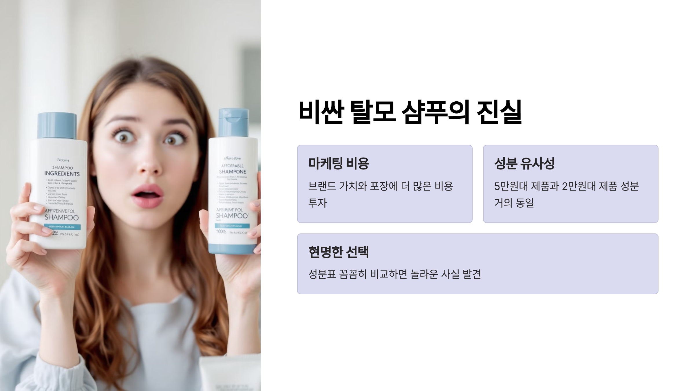 2만원대 저렴한 탈모 샴푸와 5만원 이상의 비싼 탈모 샴푸 사이에 실제로 큰 효과 차이가 있나요? 비싼 제품에는 어떤 추가적인 가치가 있는지 궁금합니다.