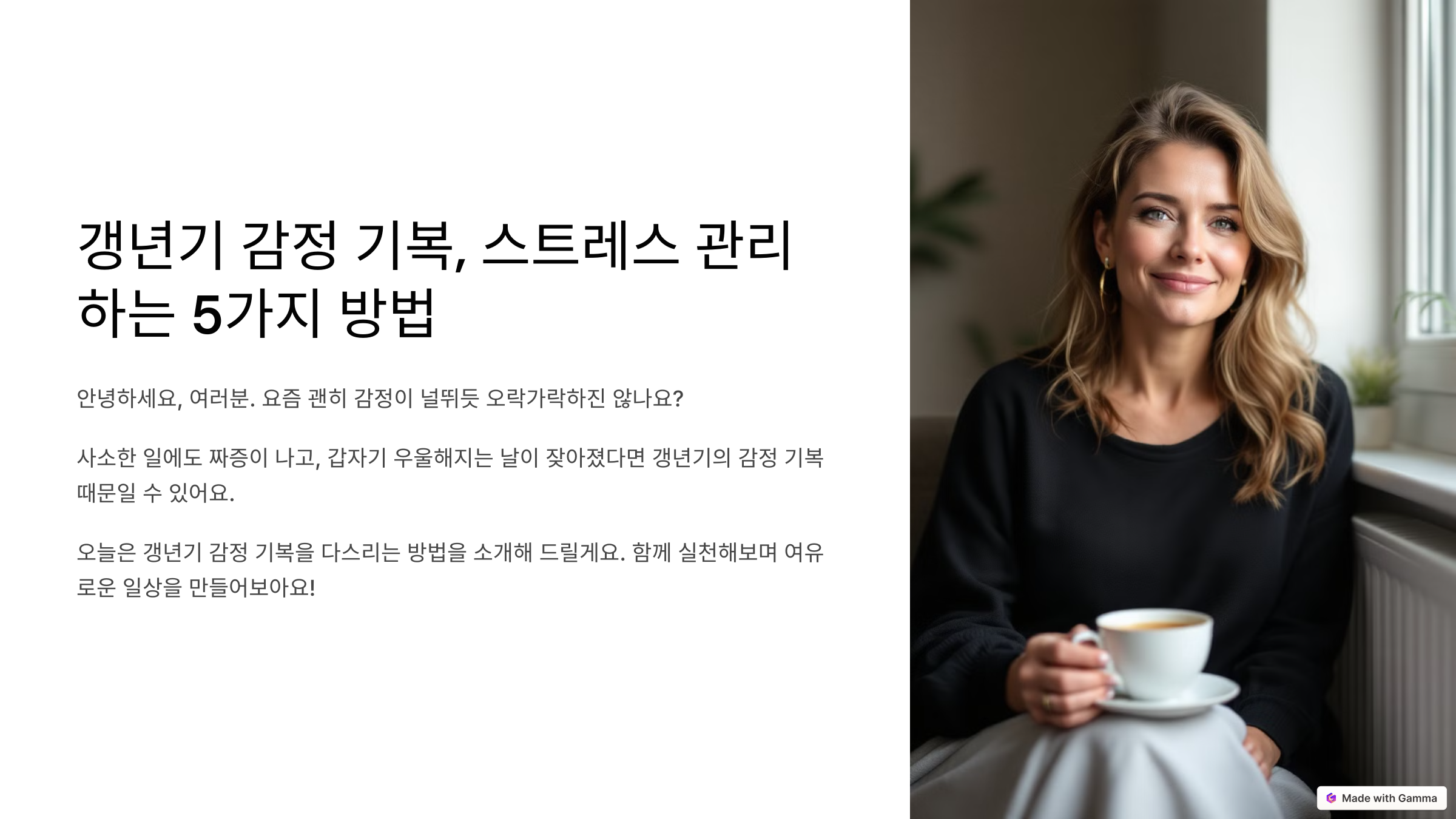 갱년기의 감정 기복과 스트레스, 충분히 이해하고 관리할 수 있습니다. 중요한 것은 스스로를 탓하거나 억지로 감정을 억누르지 않는 거예요. 몸이 변화하는 과정에서 감정도 자연스럽게 변할 수 있다는 걸 받아들이는 것이 첫걸음이죠. 생활 습관을 조금씩 바꾸고, 주변 사람들과 감정을 나누며, 필요하면 전문가의 도움을 받으면서 자신만의 균형을 찾아보세요.