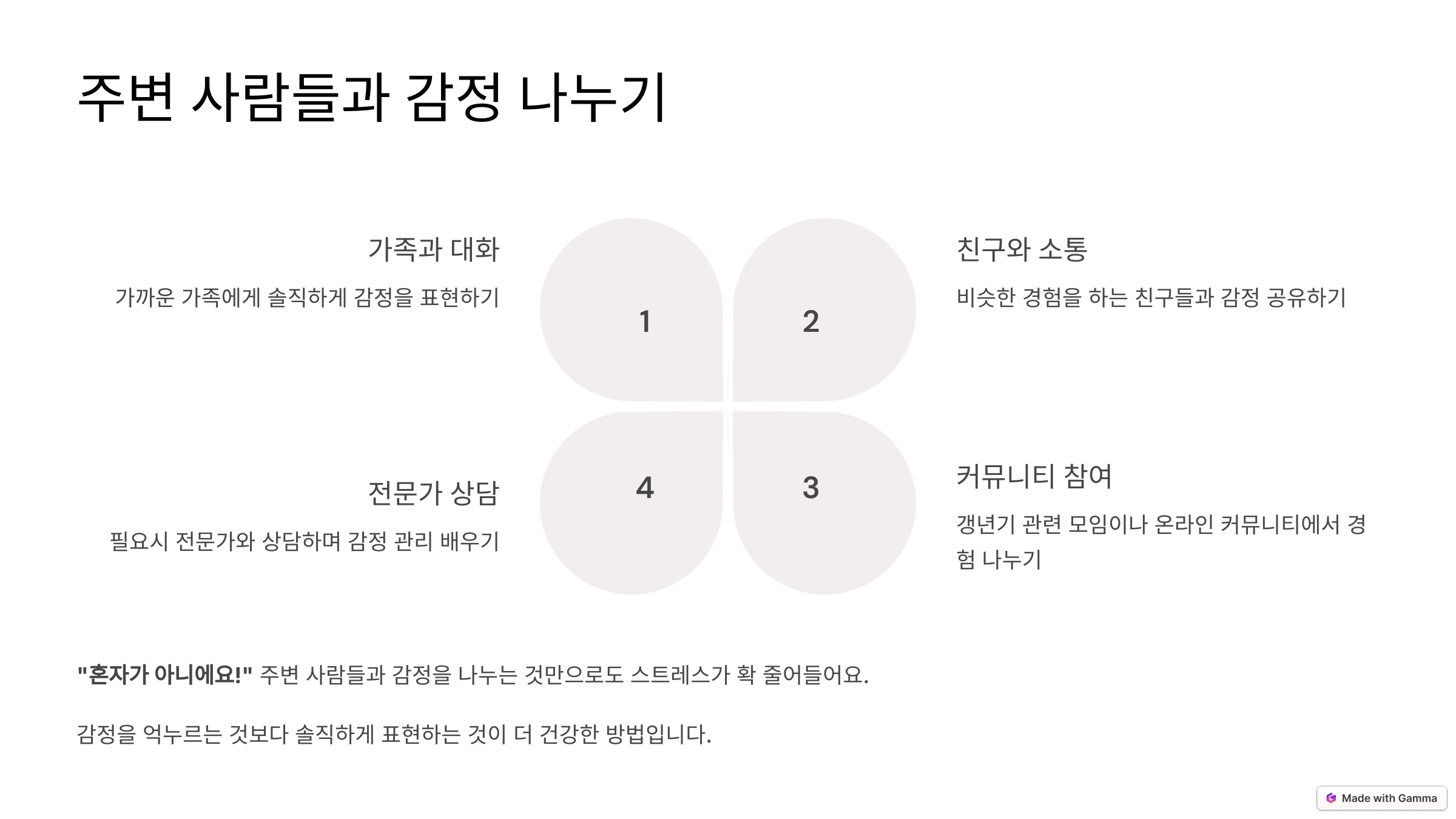 특히 같은 경험을 하고 있는 사람들과 대화하면 위로가 되기도 해요. 온라인 커뮤니티나 갱년기 관련 모임에 참여해보는 것도 좋은 방법이죠. 감정을 억누르는 것보다 솔직하게 표현하는 것이 더 건강한 방법이라는 사실, 기억하세요!