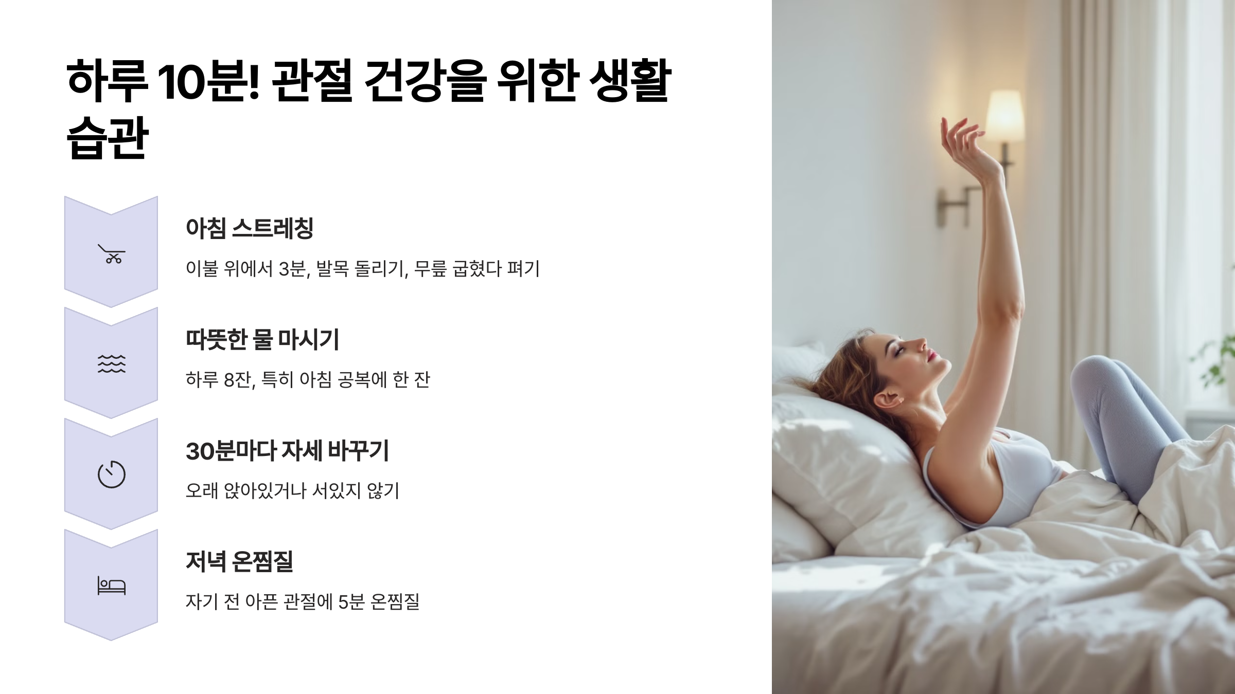 제가 의사 선생님께 배우고, 실제로 6개월간 지켜보니 관절 통증이 확실히 줄었던 생활 습관들을 공유해 드릴게요. 정말 간단하지만 효과는 놀라웠답니다!