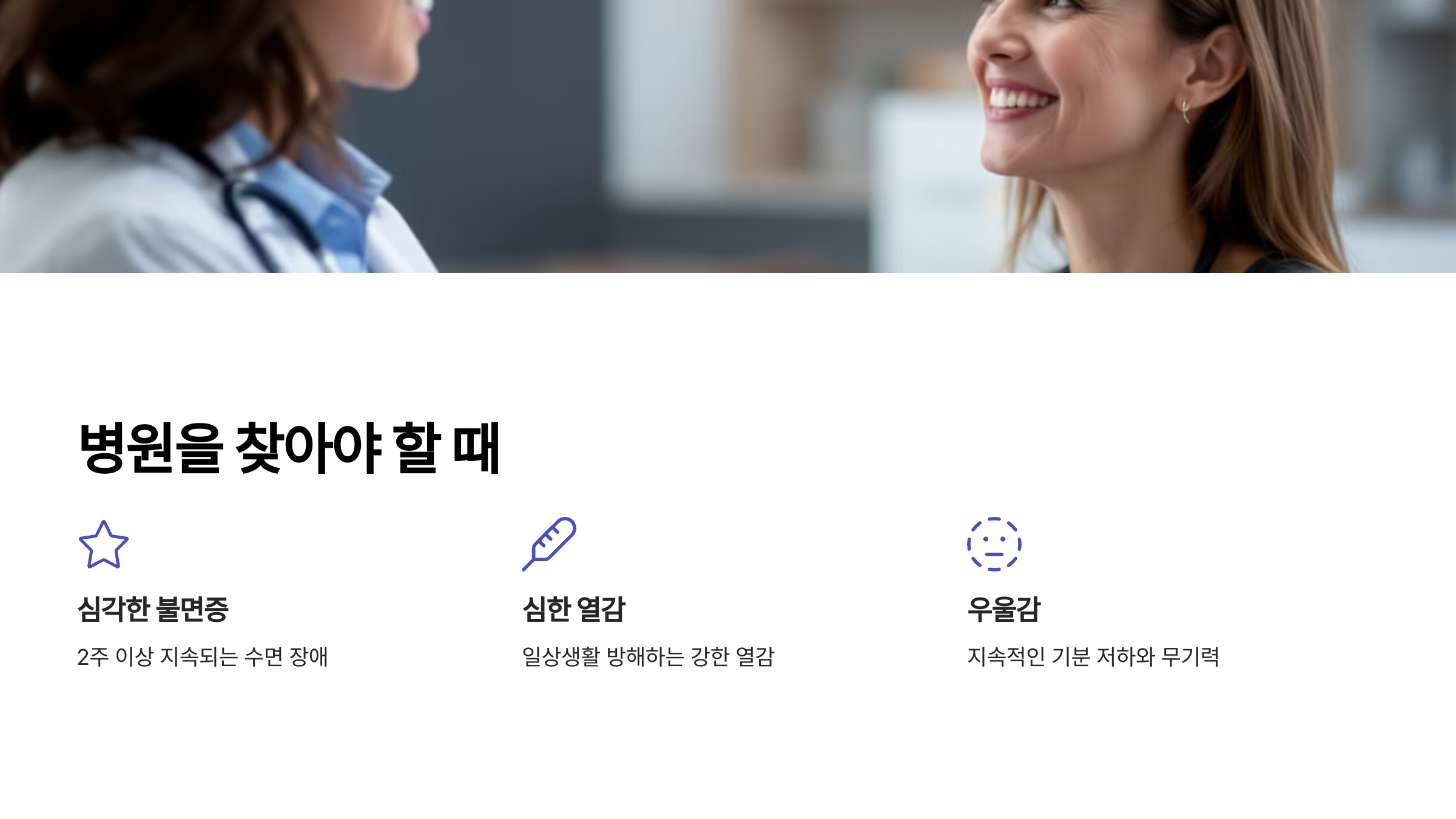 자연 요법을 시도해도 2-3개월 이상 수면 문제가 개선되지 않는다면, 반드시 의사와 상담하세요. 갱년기 증상 외에 다른 수면 장애(수면무호흡증, 하지불안증후군 등)가 있을 수도 있습니다.