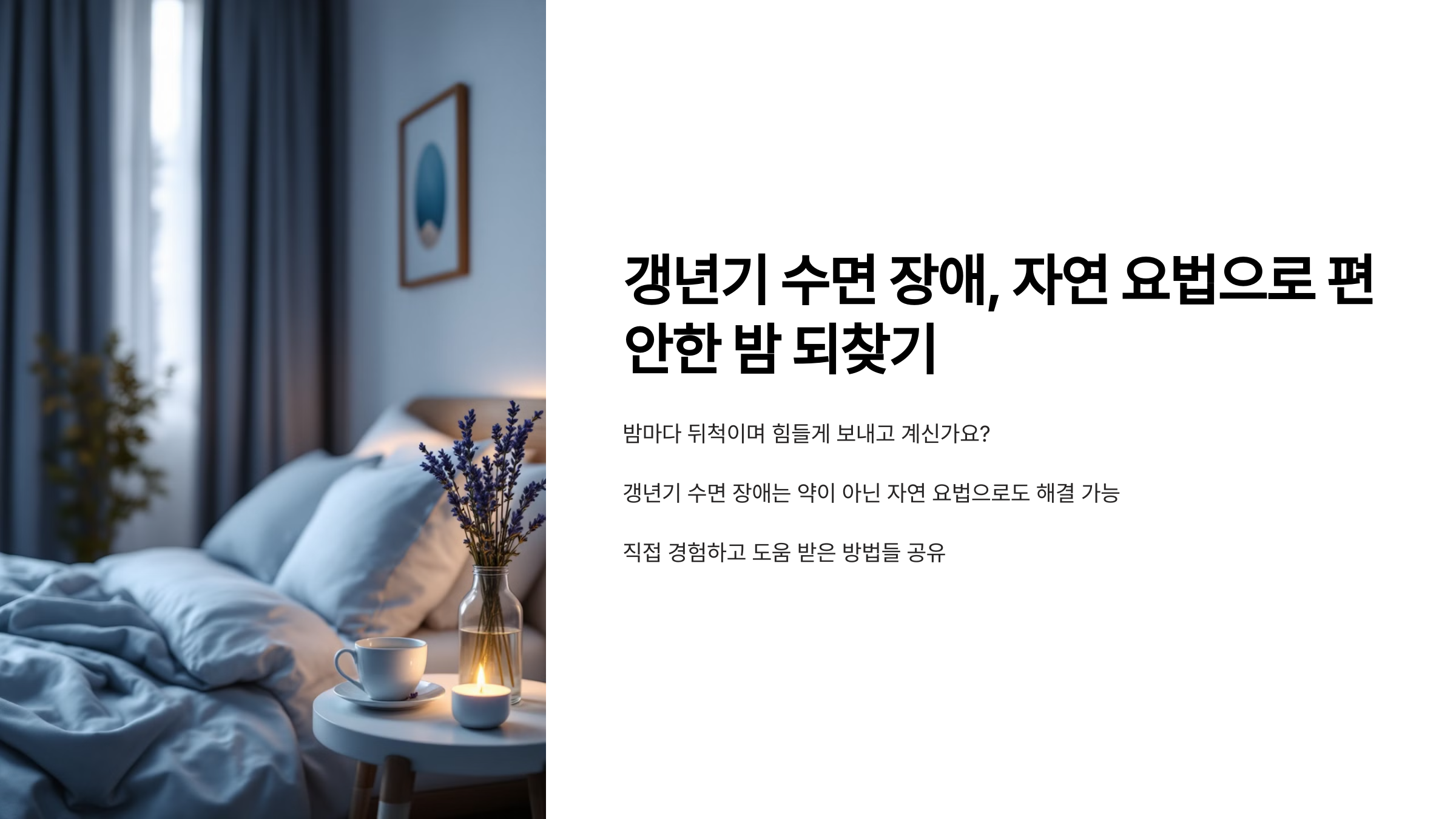 밤마다 뒤척이며 힘들게 보내고 계신가요? 갱년기 수면 장애는 약이 아닌 자연 요법으로도 해결할 수 있답니다!