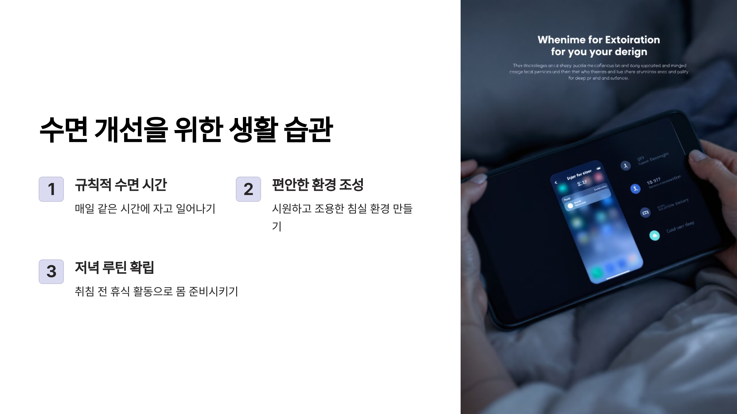 3. 취침 전 루틴 만들기잠들기 1시간 전부터는 휴대폰, TV 등 전자기기 사용을 중단하고 책읽기, 명상, 따뜻한 샤워 같은 편안한 활동으로 전환하세요. 저는 취침 전 10분 스트레칭, 15분 독서, 5분 감사일기 쓰기를 루틴으로 만들었어요.