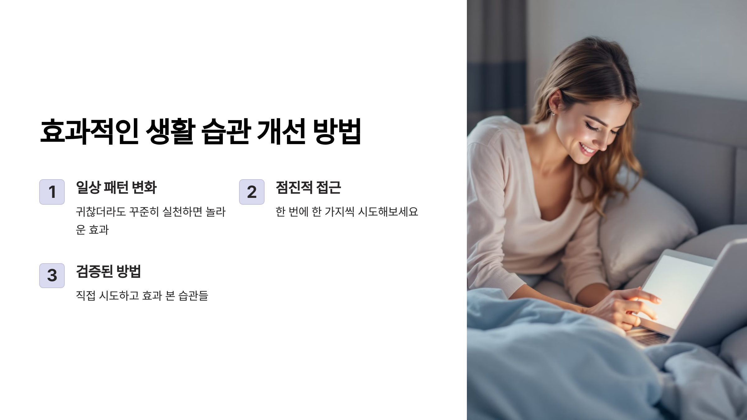 아래 생활 습관 개선 방법들은 제가 직접 시도해보고 효과를 본 것들이에요. 하루아침에 모든 것을 바꾸려 하지 말고, 한 번에 한 가지씩 시도해보세요.