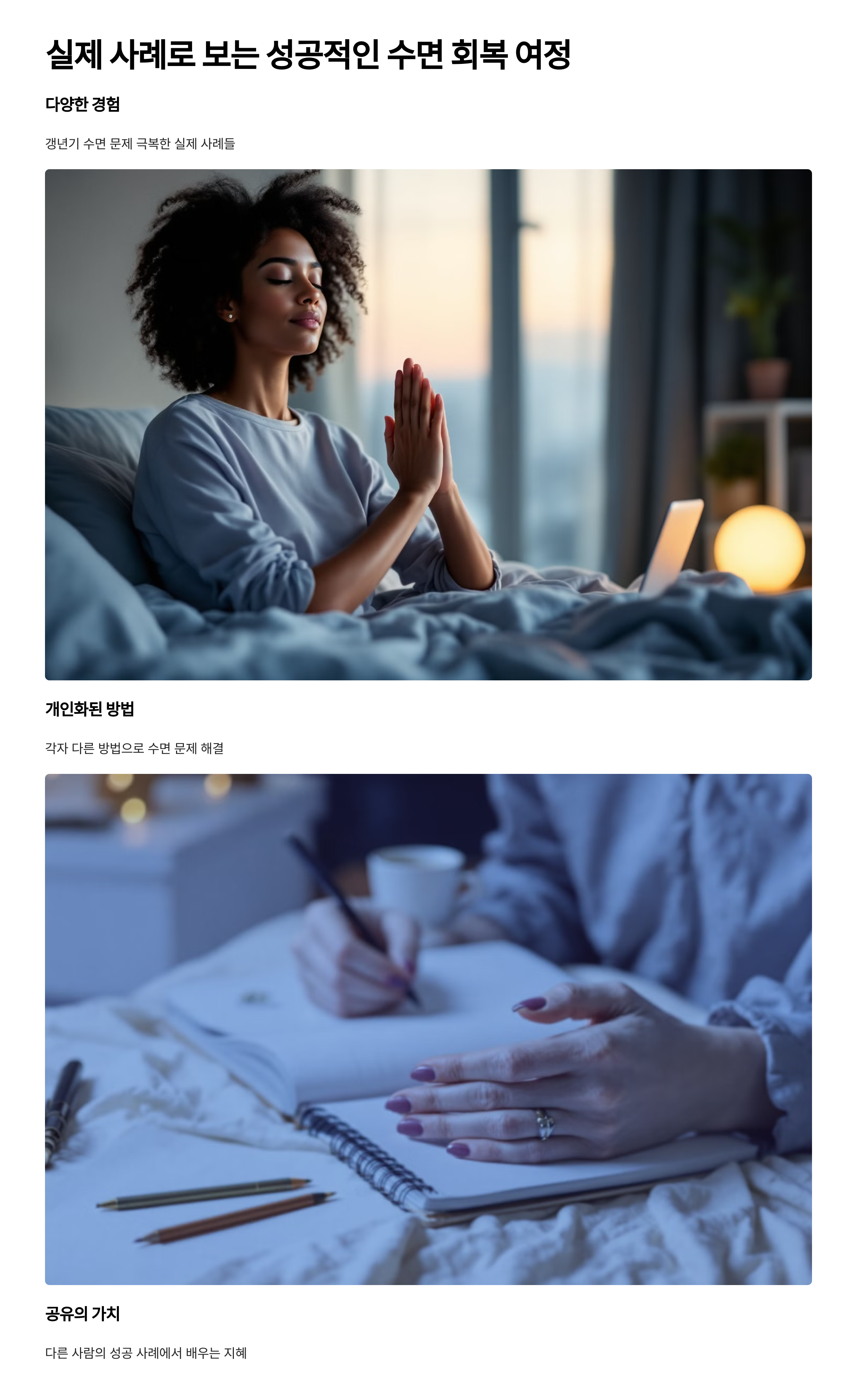 제 경험도 좋지만, 다양한 사례를 통해 배울 수 있는 점이 많죠. 제가 갱년기 수면 문제로 고민하는 여성들의 모임에 참여하면서 만난 분들의 이야기를 함께 나누고 싶어요. 각자 다른 방법으로 수면 문제를 극복한 실제 사례입니다.