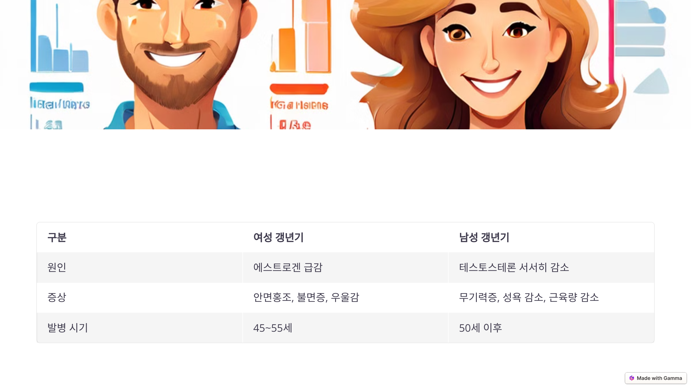 갱년기는 성별에 따라 증상과 원인이 다르게 나타납니다. 여성은 급격한 호르몬 변화로 인해 증상이 강하게 나타나지만, 남성은 서서히 변화하기 때문에 자각하지 못하는 경우가 많죠. 아래 표를 통해 주요 차이점을 한눈에 비교해볼까요?