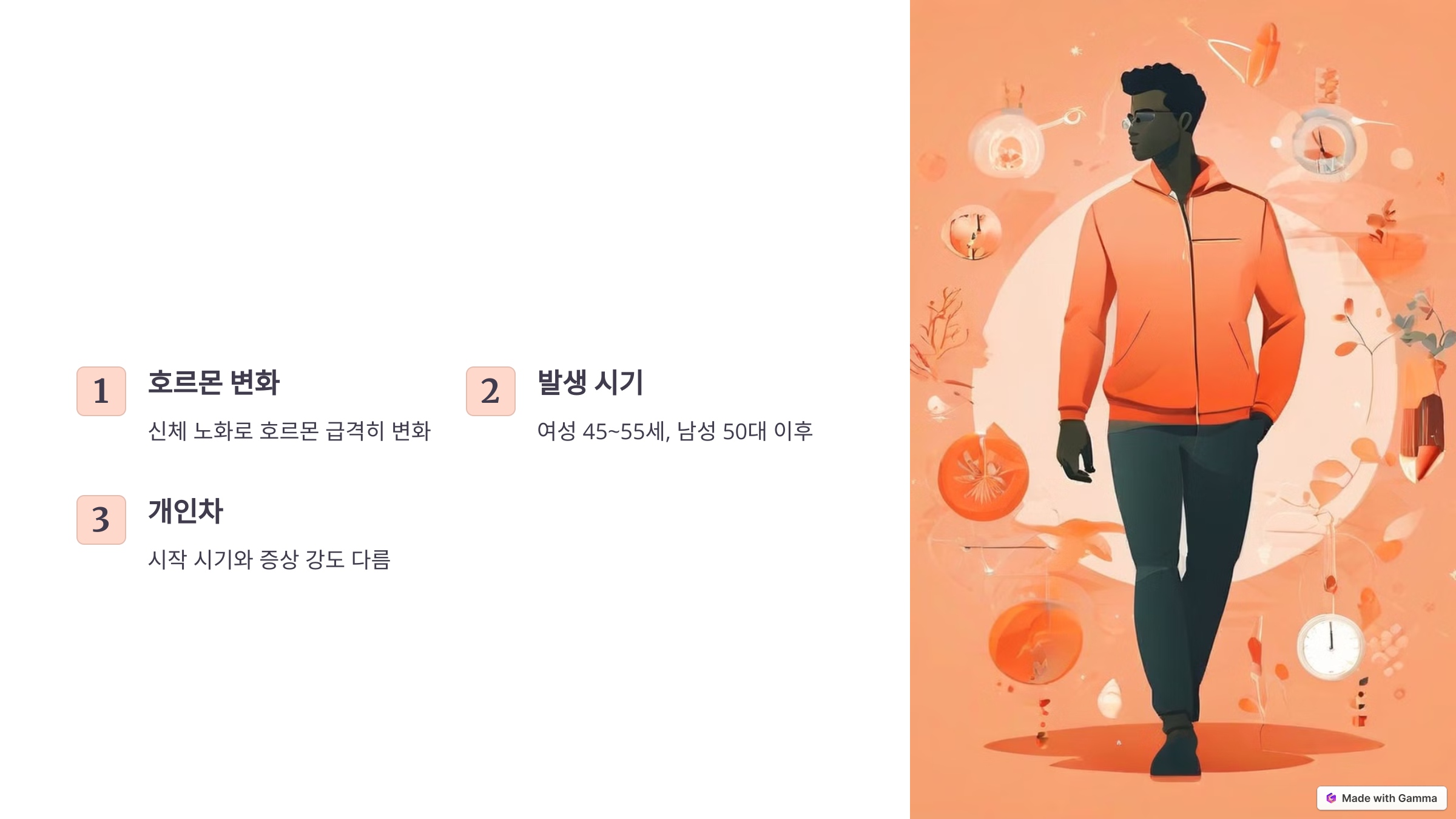 히 일어나는 시기를 뜻합니다. 주로 여성은 폐경과 함께 갱년기를 맞이하며, 남성도 나이가 들면서 테스토스테론 수치가 감소하면서 갱년기 증상을 경험하게 됩니다. 보통 여성은 45~55세 사이, 남성은 50대 이후에 갱년기를 겪기 시작하는데요. 하지만 사람마다 갱년기의 시작 시기와 증상의 강도가 다를 수 있습니다. 호르몬 변화는 단순한 생리적 변화가 아니라, 감정과 정신 건강에도 큰 영향을 미친다는 점이 중요합니다.