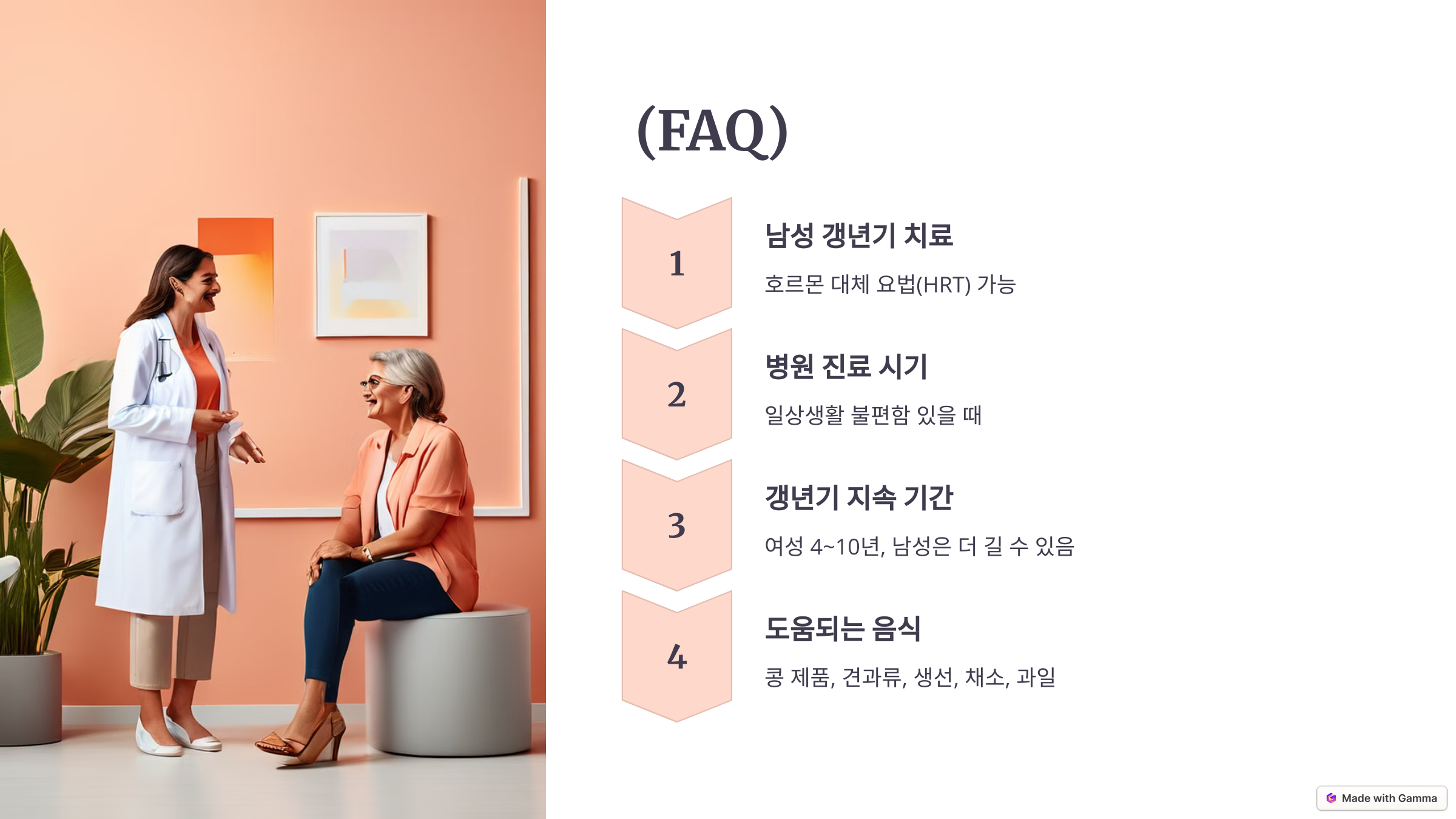 개인마다 다르지만, 여성의 경우 평균 4~10년 정도 지속됩니다. 남성 갱년기는 점진적으로 진행되며, 지속 기간이 더 길어질 수 있습니다.