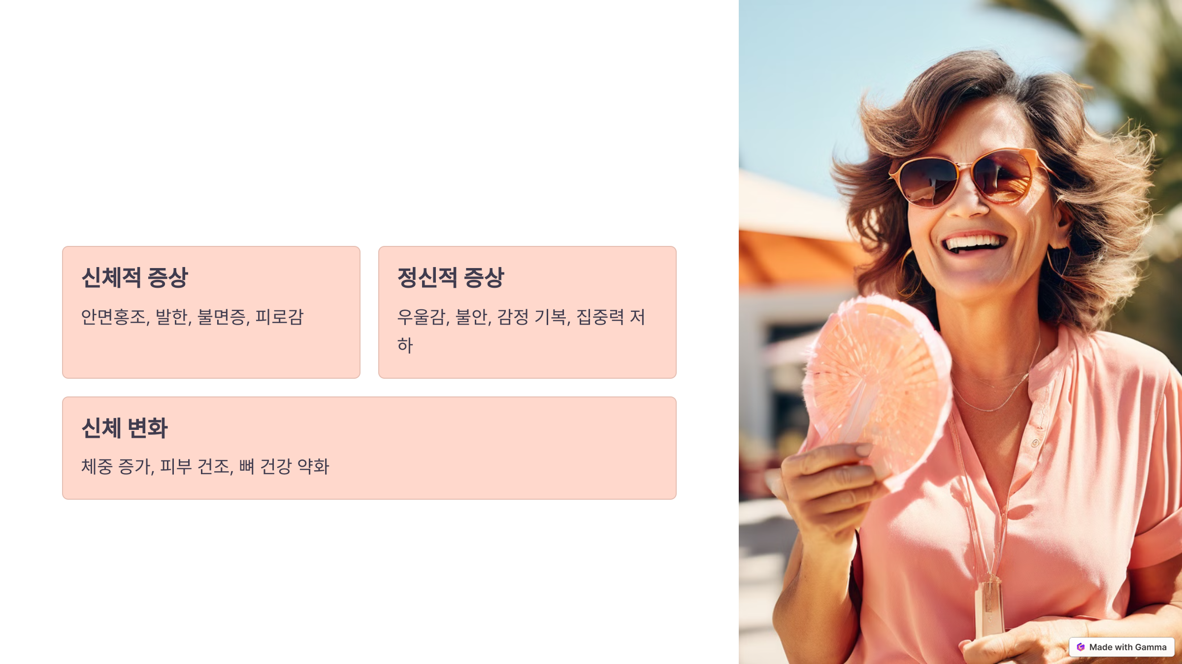여성 갱년기는 에스트로겐 감소와 함께 나타나며, 신체적 증상뿐만 아니라 정신적인 변화도 동반됩니다. 대표적인 증상으로는 다음과 같습니다.