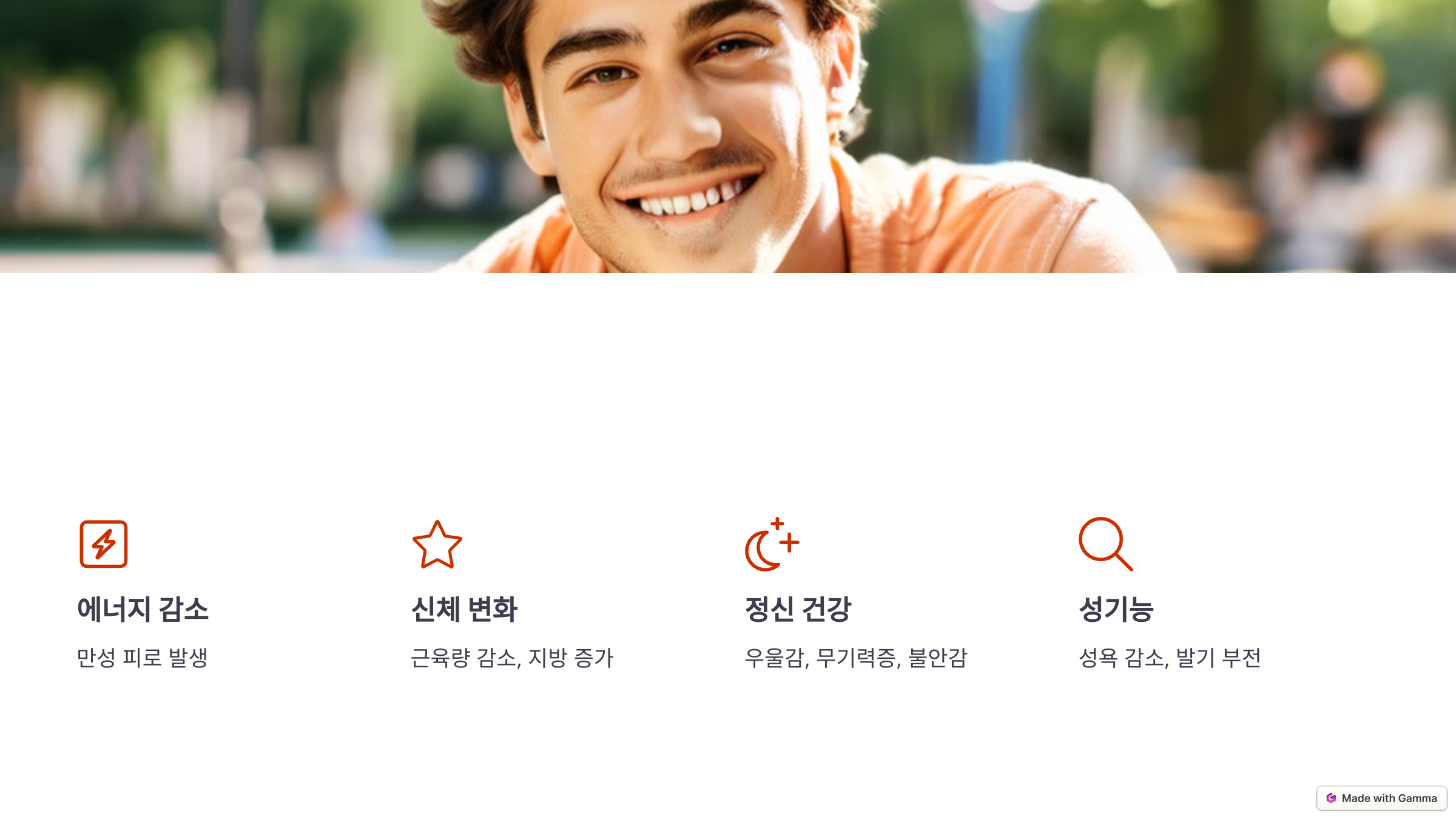 | 증상 | 안면홍조, 불면증, 우울감 | 무기력증, 성욕 감소, 근육량 감소 |