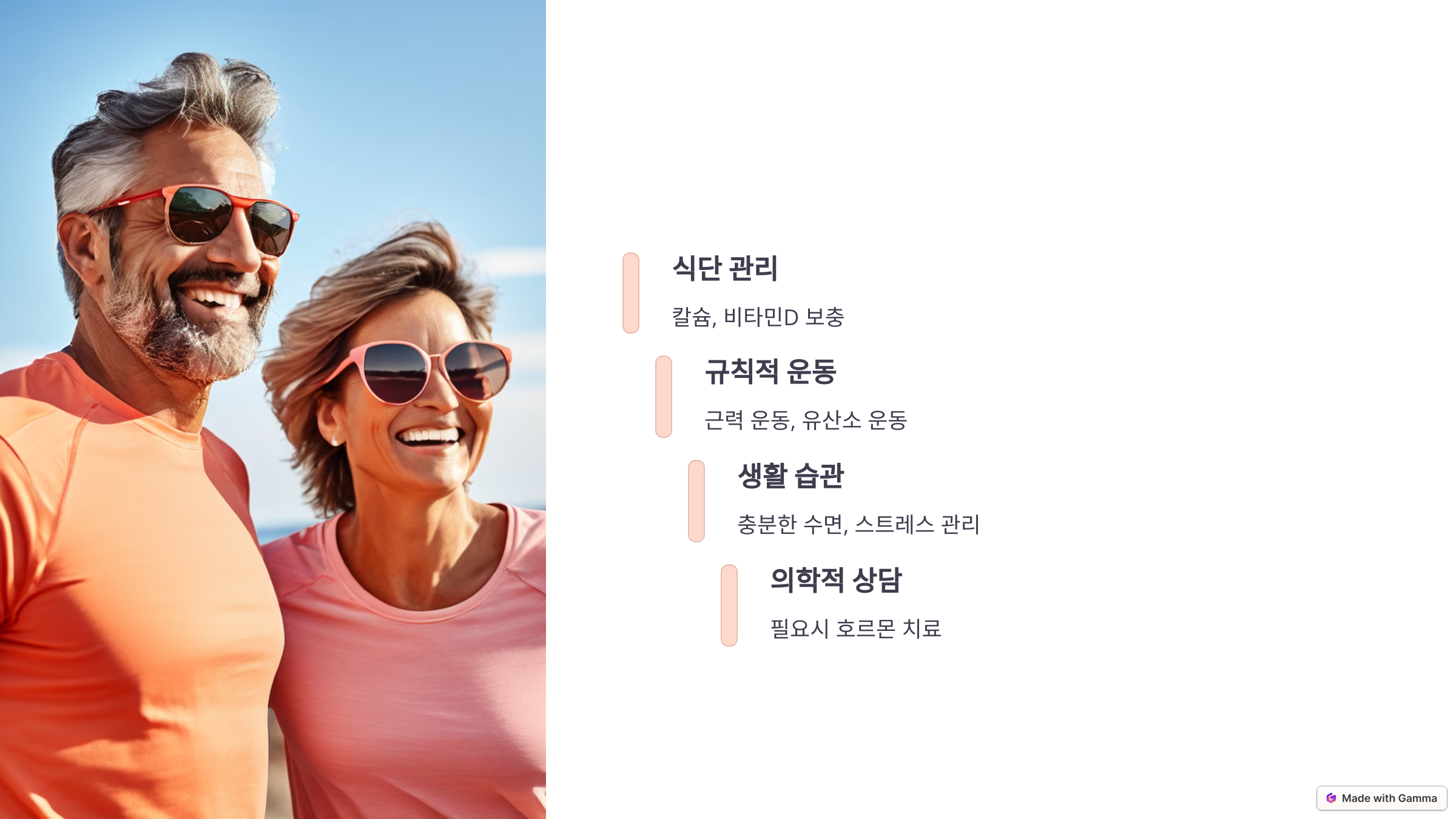 • 균형 잡힌 식단 유지하기 (칼슘, 비타민D 보충)