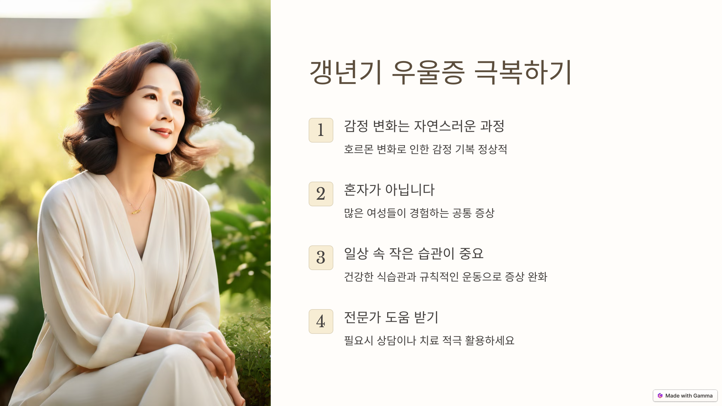 나이가 들면서 감정 기복이 심해지고, 이유 없이 우울한 기분이 드시나요? 갱년기 우울증, 더 이상 혼자 고민하지 마세요. 일상 속 작은 변화가 기적을 만듭니다.