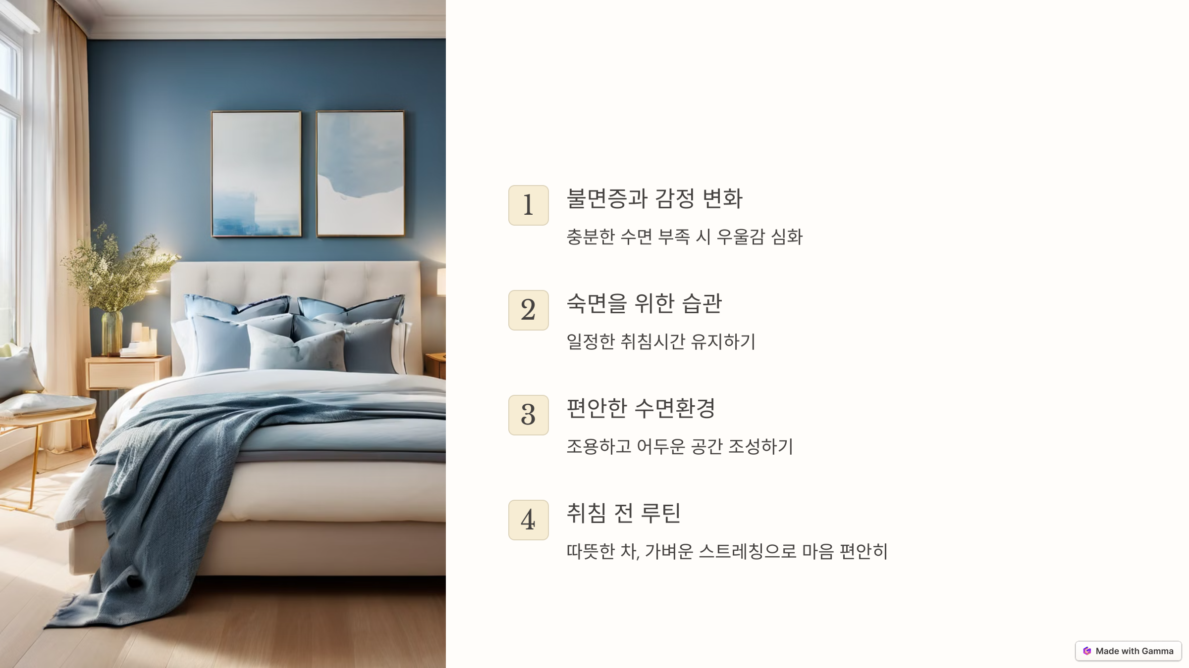잠을 푹 자는 것은 기분을 조절하는 데 필수적입니다. 숙면을 위한 작은 노력이 긍정적인 변화를 가져올 거예요.