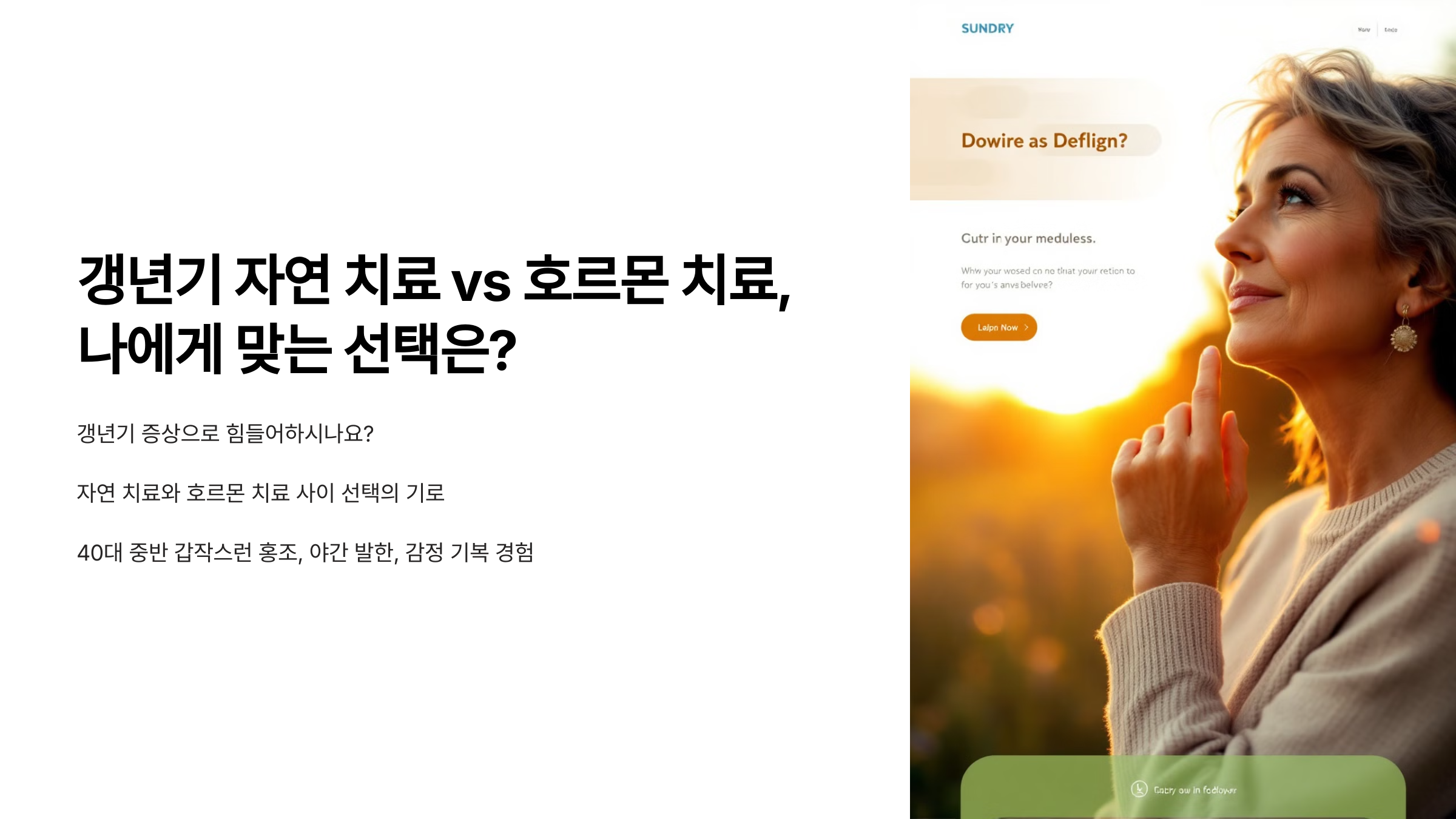안녕하세요, 여러분! 저는 40대 중반에 갑자기 찾아온 갱년기 증상으로 정말 힘든 시간을 보냈었어요. 열이 확 올라오는 홍조에, 밤마다 땀으로 뒤범벅이 되고, 감정 기복은 또 얼마나 심했던지... 그때 저는 '이걸 어떻게 이겨내지?' 하는 고민이 정말 컸습니다. 자연 요법을 시도해볼까, 아니면 바로 호르몬 치료를 시작할까 망설이던 그 시간이 아직도 생생해요. 오늘은 제가 겪었던 경험과 함께 많은 분들이 궁금해하시는 갱년기 자연 치료와 호르몬 치료에 대한 진짜 이야기를 나눠보려고 합니다.