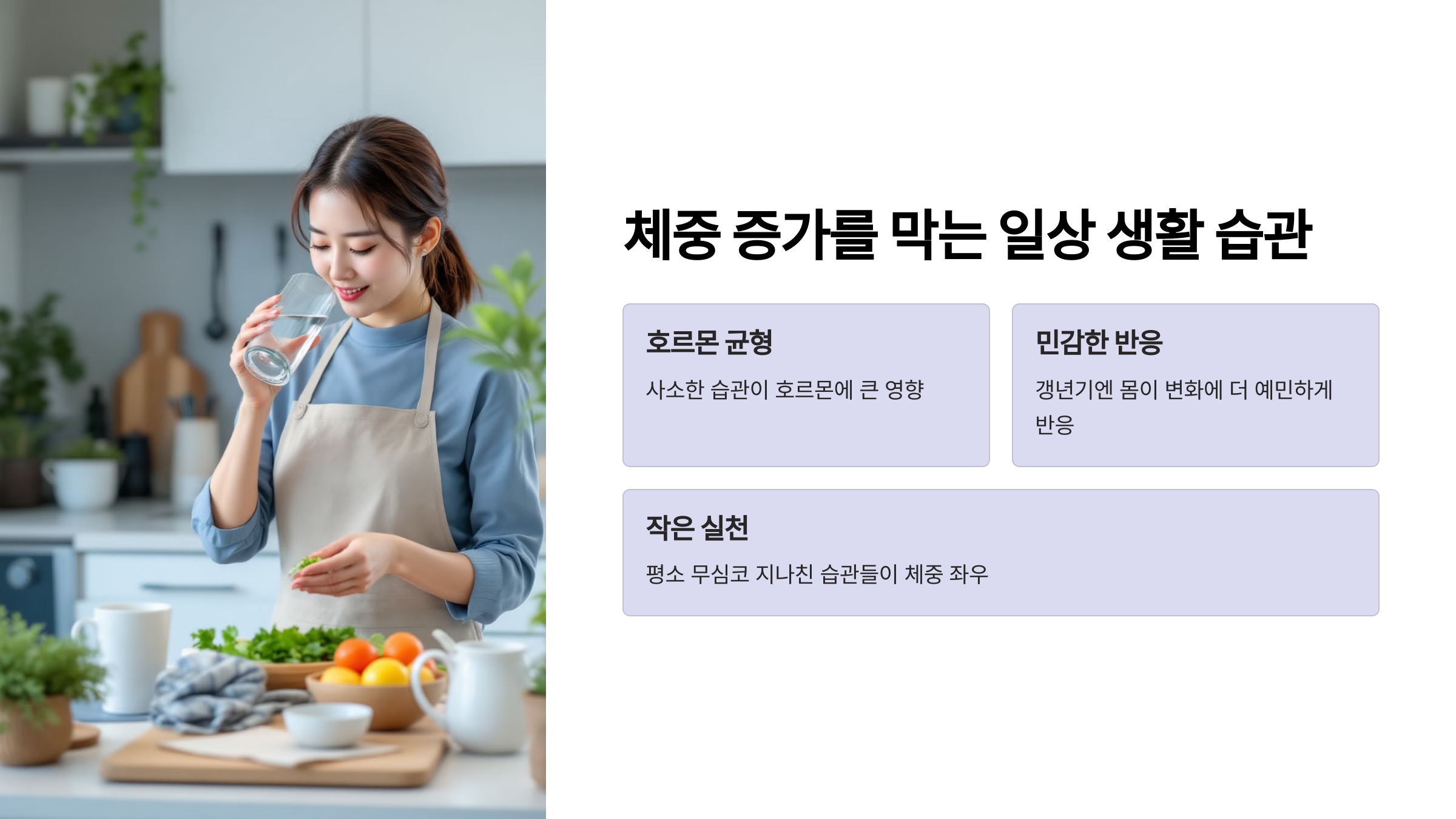특히 갱년기 시기에는 몸의 변화에 더 민감하게 반응하기 때문에, 평소에 크게 신경 쓰지 않던 습관들이 체중 변화에 큰 영향을 미칠 수 있어요. 제가 실천해본 효과적인 생활 습관들을 공유해 볼게요.