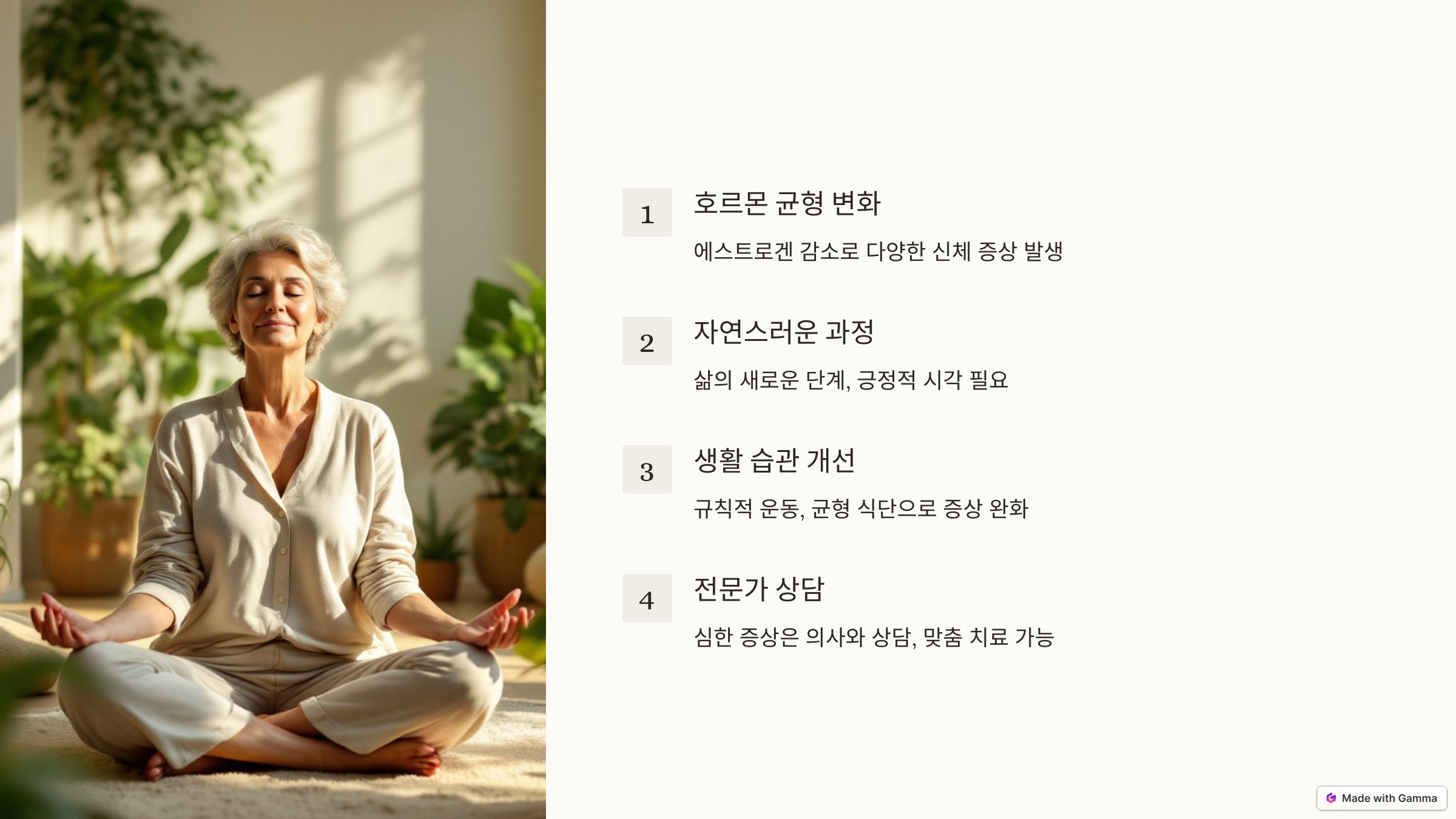 갱년기, 피할 수 없다면 건강하게 극복하는 방법을 찾아야겠죠? 인생의 새로운 장을 활기차게 열어보세요!
