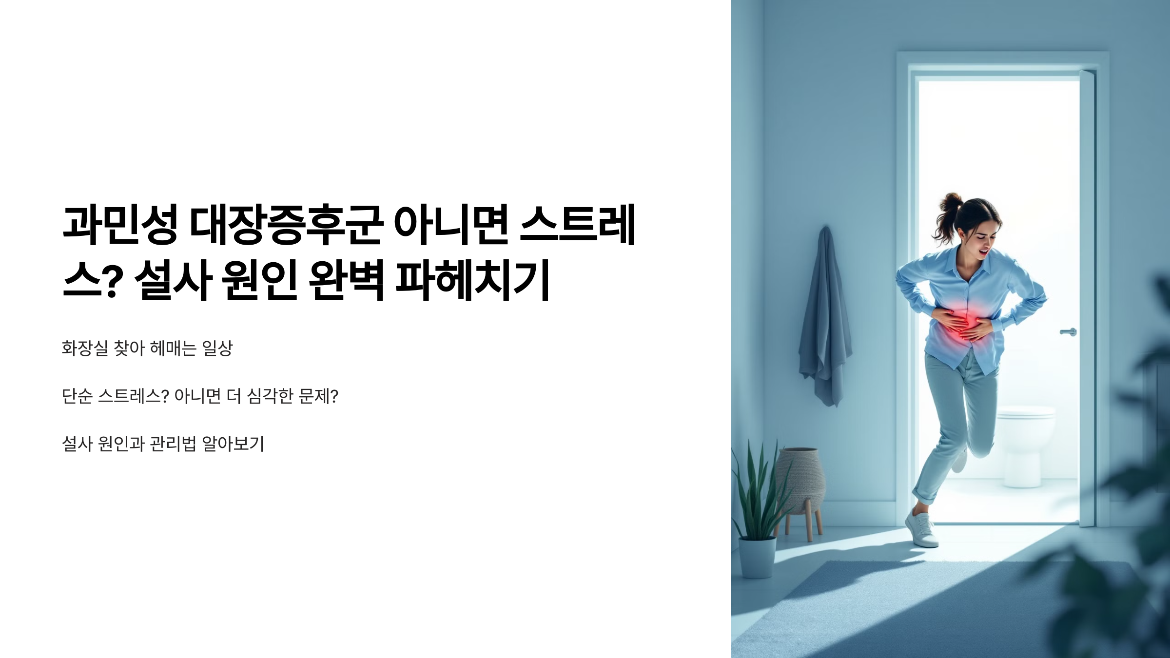 안녕하세요, 여러분! 오늘은 좀 민감할 수도 있지만 많은 사람들이 겪고 있는 문제에 대해 이야기해보려고 해요. 지난달 저도 프로젝트 마감 기한에 쫓기면서 갑자기 찾아온 배변 문제로 고생했거든요. 화장실을 들락날락하면서 '이게 단순 스트레스인지 아니면 뭔가 더 심각한 문제인지' 고민했었죠. 의사와 상담하고 여러 자료를 찾아보면서 알게된 정보들을 여러분과 공유하고 싶어요. 설사의 원인이 과민성 대장증후군인지 단순 스트레스인지, 그리고 어떻게 관리할 수 있는지 함께 알아봅시다.