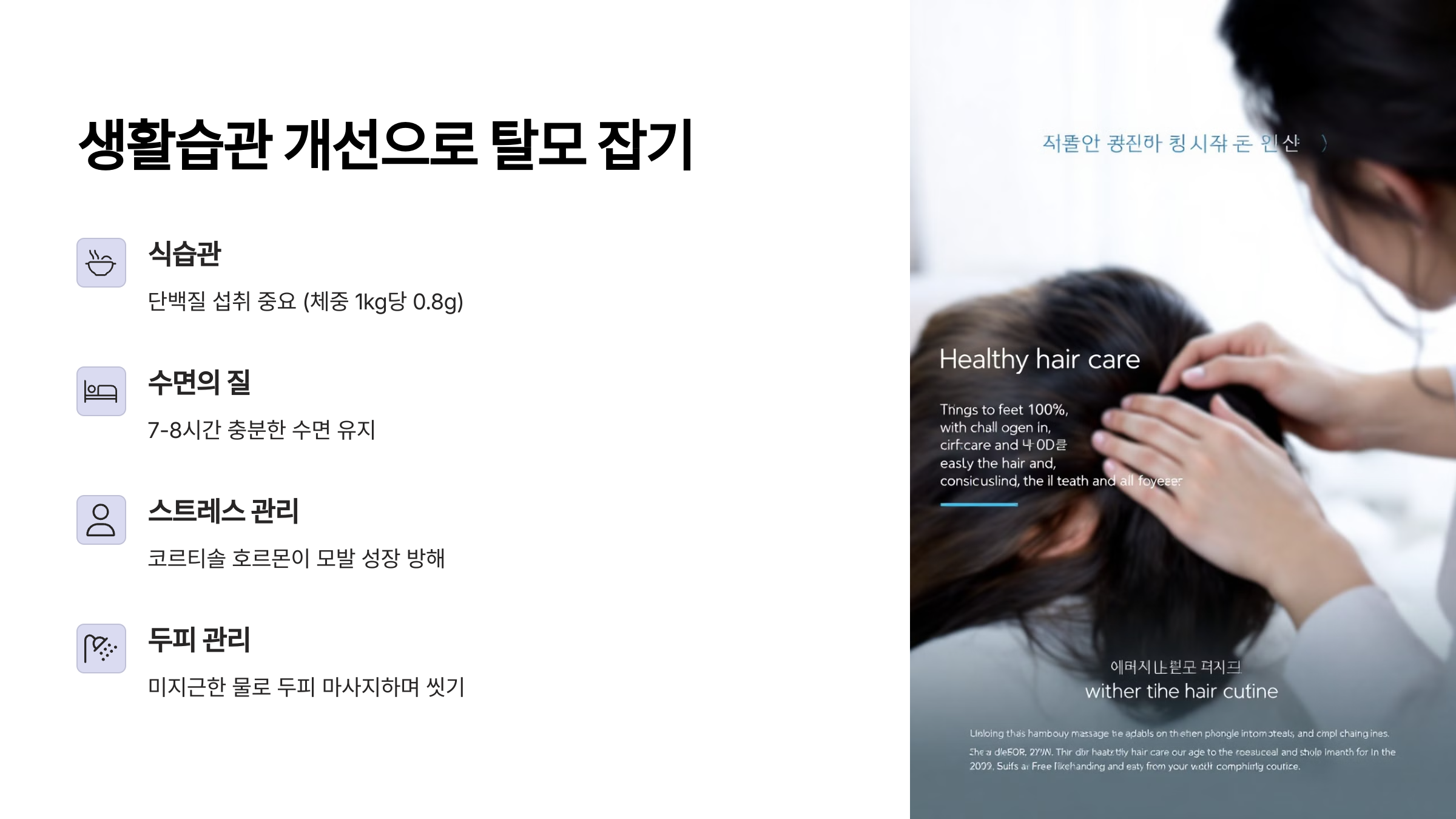 - 스트레스 관리: 여성 탈모에서 스트레스는 정말 중요한 요인입니다. 명상, 요가, 충분한 수면 등으로 스트레스를 줄이세요.