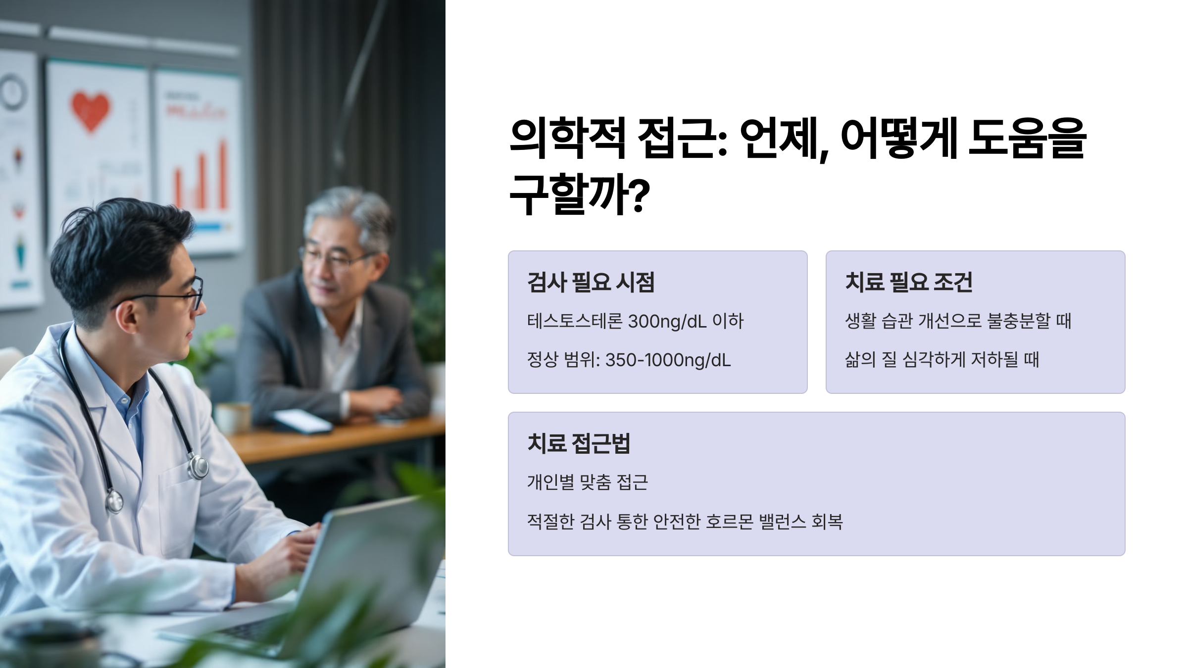 생활 습관 개선만으로 충분하지 않은 경우가 있습니다. 특히 테스토스테론 수치가 300ng/dL 이하로 떨어진 경우(일반적으로 350-1000ng/dL이 정상 범위), 또는 증상이 심각하게 삶의 질을 저하시키는 경우에는 의학적 접근이 필요할 수 있어요.