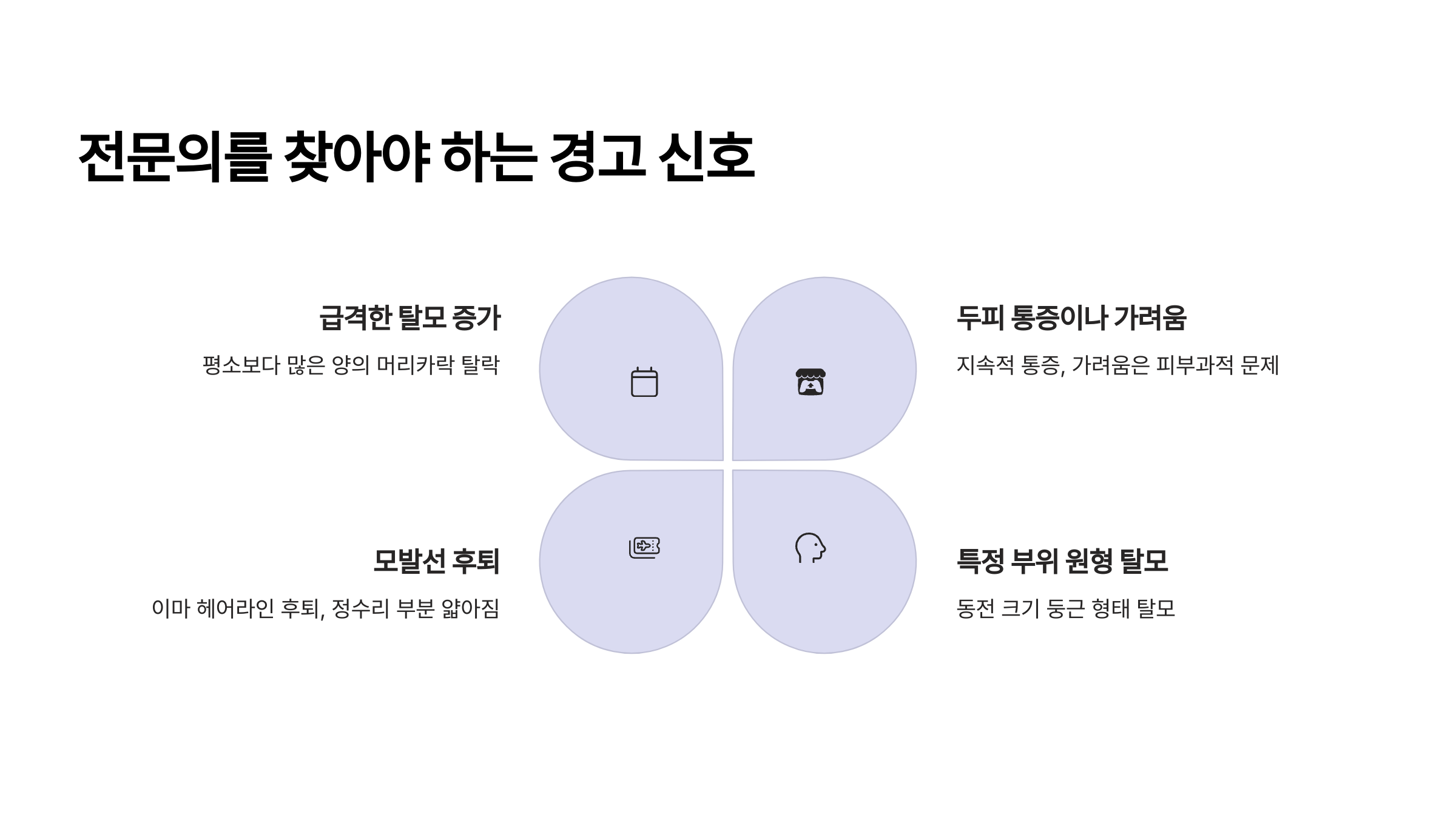 - 기타 건강 문제와 함께 나타나는 탈모: 체중 변화, 피로감, 불규칙한 생리, 우울증 등의 증상과 함께 탈모가 나타난다면 갑상선 질환이나 다른 내분비 문제를 의심해볼 수 있습니다.