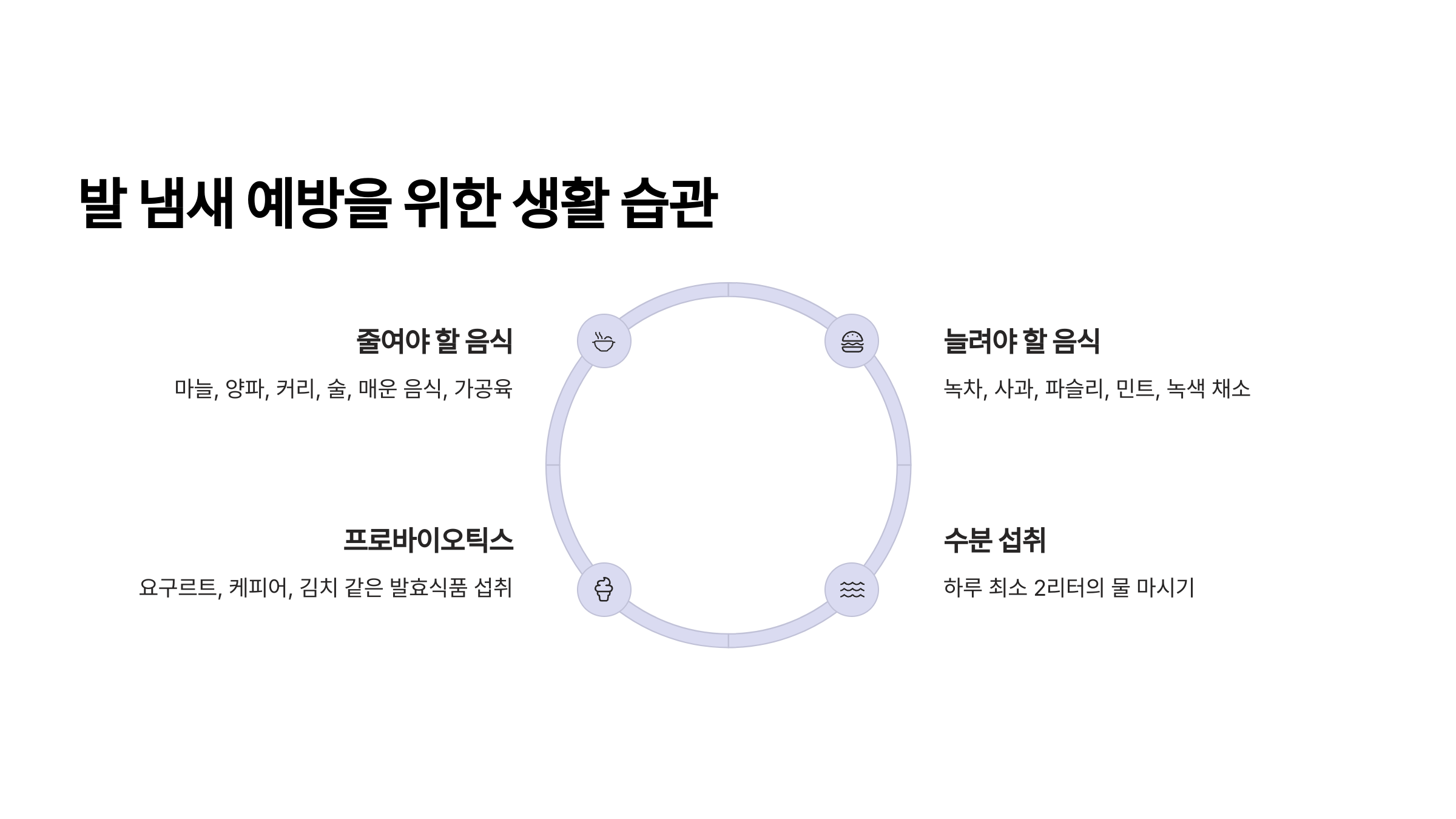 - 늘려야 할 음식: 녹차, 사과, 파슬리, 민트, 레몬, 오이, 시금치, 클로로필이 풍부한 녹색 채소들은 체내 독소 배출을 돕고 땀 냄새를 중화시키는 데 도움을 줍니다. 특히 녹차는 폴리페놀 성분이 풍부해 체내 박테리아 성장을 억제하는 효과가 있어요.