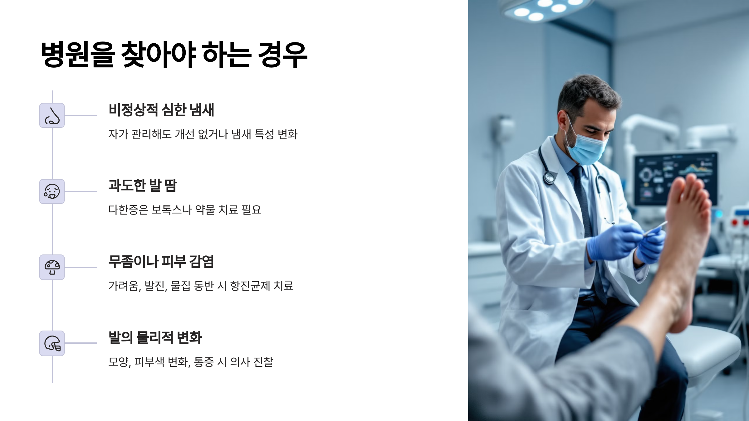 발 냄새, 대부분은 위에서 소개한 방법들로 관리가 가능해요. 하지만 때로는 이런 자가 관리만으로는 해결되지 않는 경우도 있답니다. 솔직히 저도 처음에는 '그냥 냄새일 뿐이야, 병원은 좀 오버 아닌가?' 하고 생각했었어요. 근데 사실 발 냄새가 심각한 건강 문제의 신호일 수도 있더라구요.