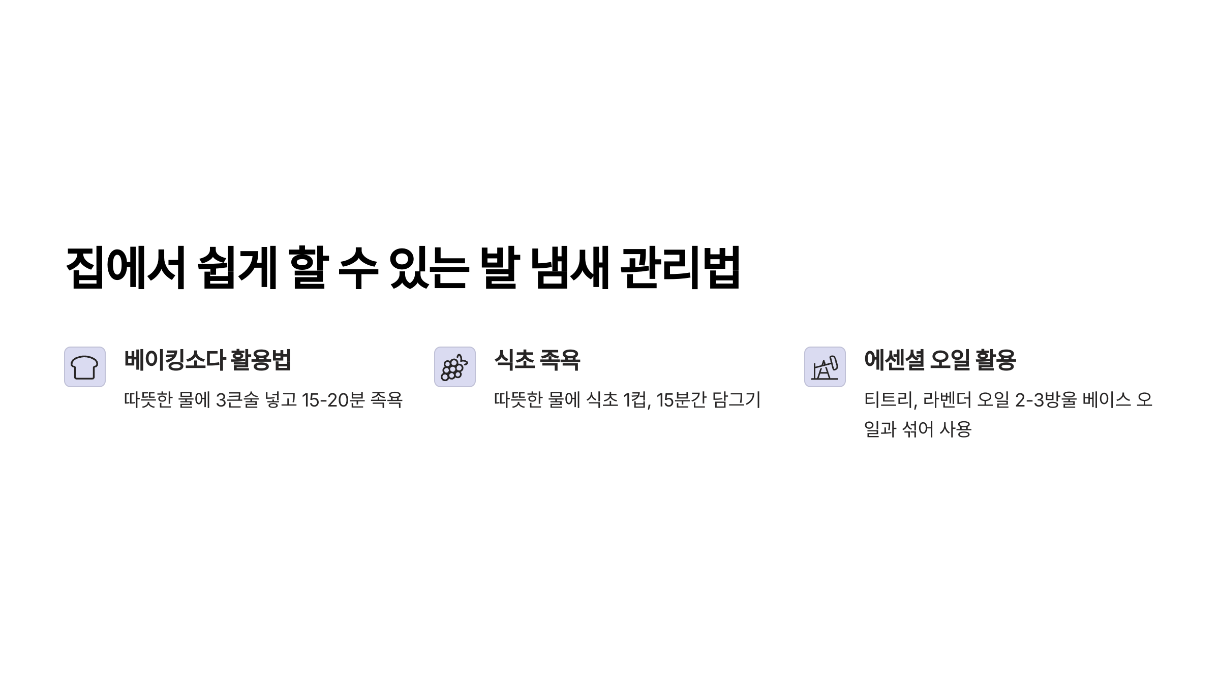 | 매일 발 씻기 | 박테리아와 땀 제거로 냄새 원인 차단 | ⭐⭐ (쉬움) |
