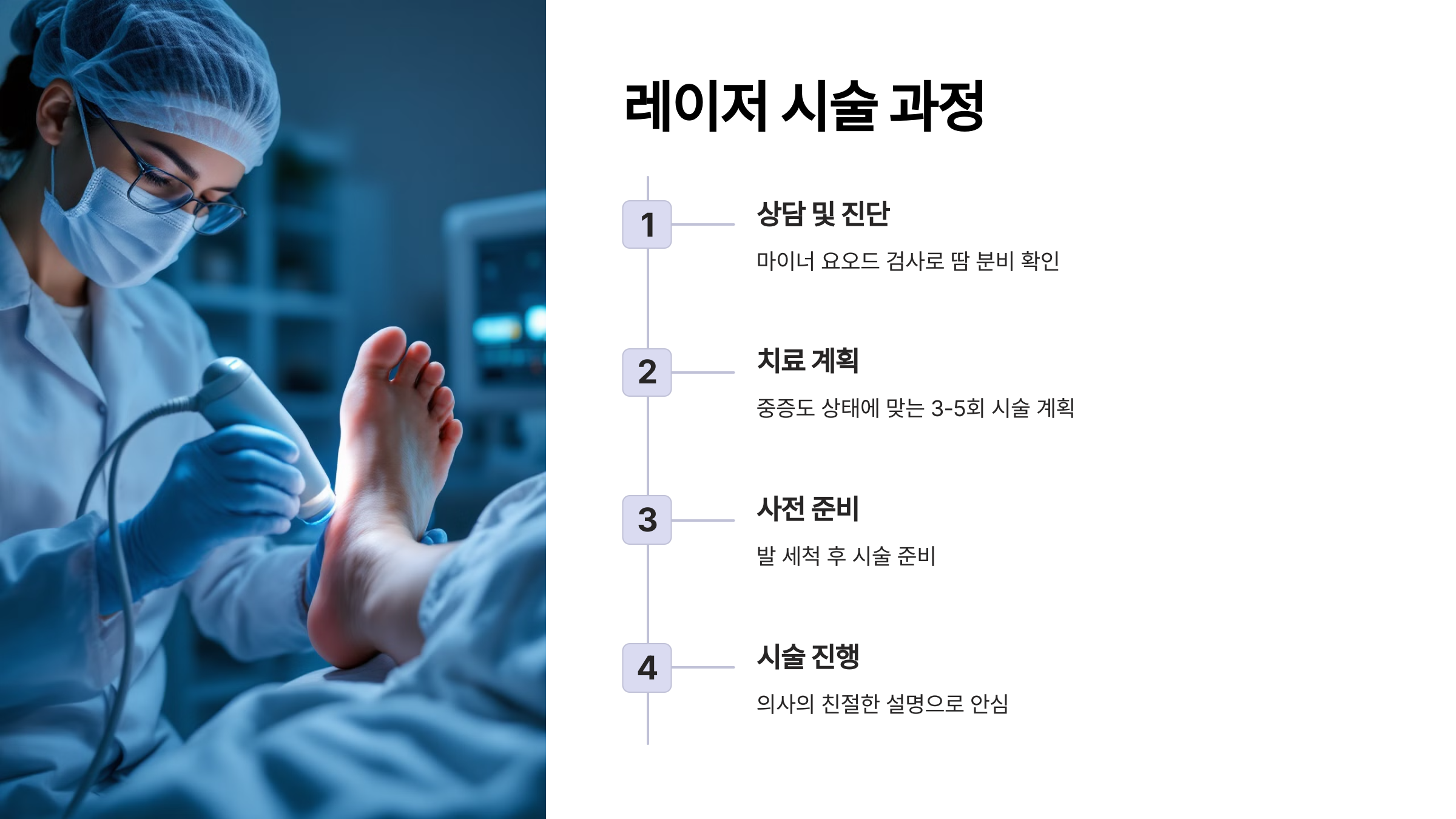 레이저 시술 직후 발이 약간 붉어지고 따끔거리는 느낌이 있었지만, 심한 통증은 전혀 없었어요. 시술 당일 병원에서 나올 때는 이미 걸어다닐 수 있을 정도였답니다. 예상보다 훨씬 간단하고 통증도 적어서 안심했었어요!