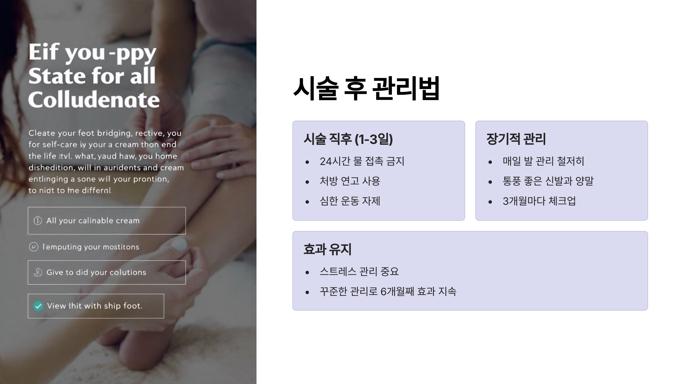 시술 직후 24시간 동안은 발에 물이 닿지 않도록 주의하세요! 저는 이 부분을 간과해서 샤워하다가 실수로 물을 묻혔는데, 그래서 그런지 첫 시술 후 효과가 좀 덜했던 것 같아요. 두 번째부터는 꼼꼼히 지켰더니 효과가 더 좋더라구요.