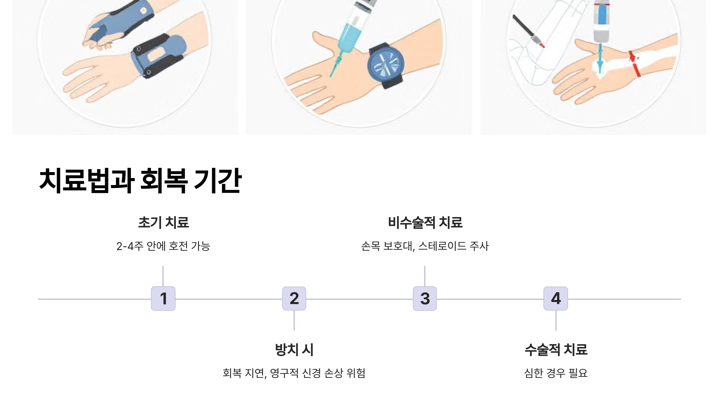 • 3단계: 스테로이드 주사손목터널 내 직접 주사로 염증 감소. 효과는 즉각적이나 일시적일 수 있으며, 6개월 내 재발 가능성.