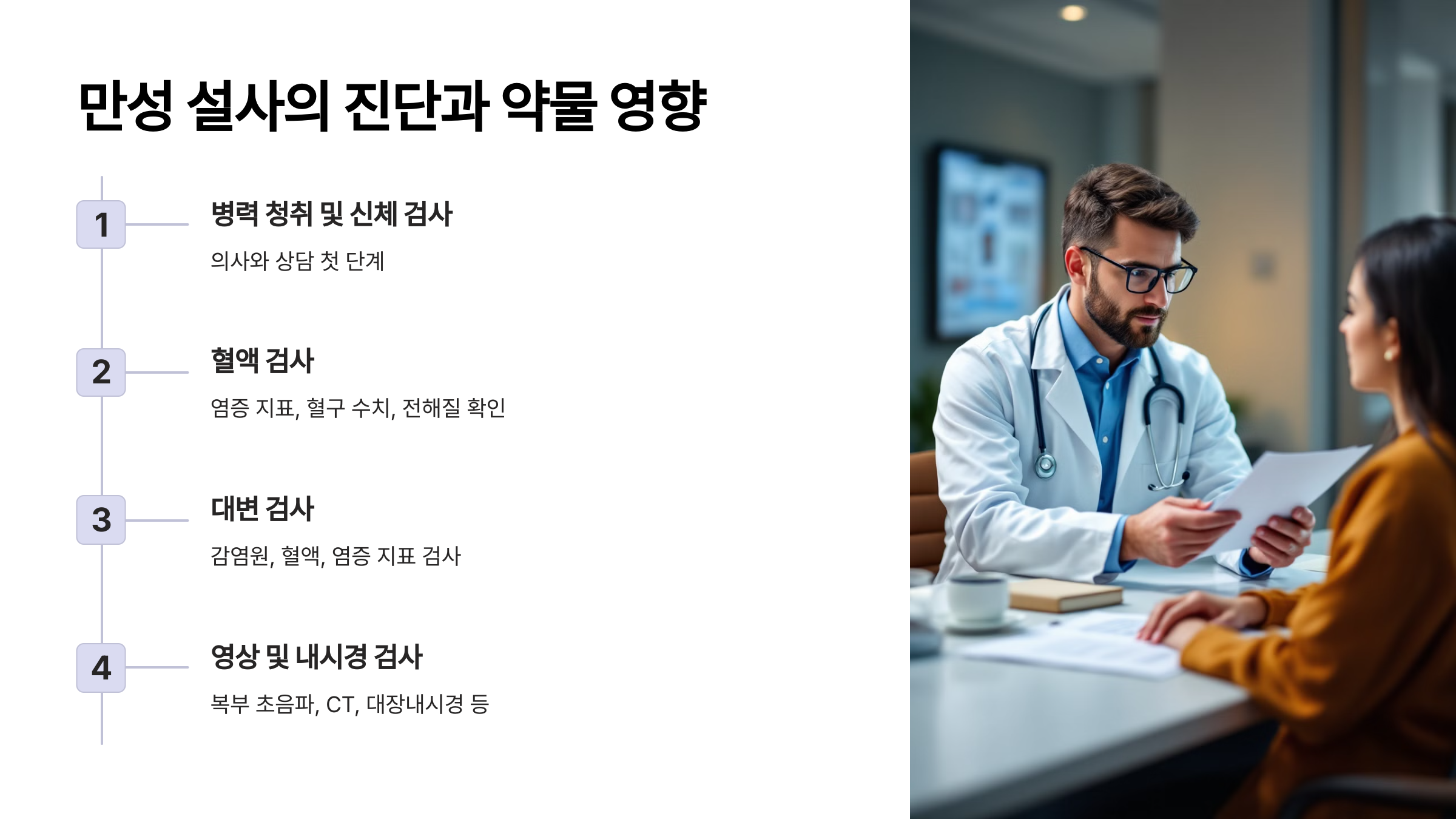 만성 설사의 원인을 찾기 위해 의사들은 다양한 검사를 실시해요. 보통 다음과 같은 순서로 진행됩니다: