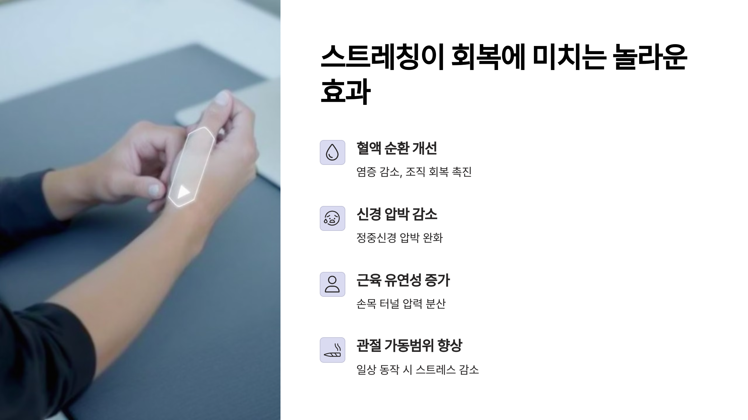 - 혈액 순환 개선: 손목 부위의 혈액 순환이 좋아지면 염증이 줄어들고 조직 회복이 빨라져요. 특히 저린 증상 개선에 도움이 크죠.