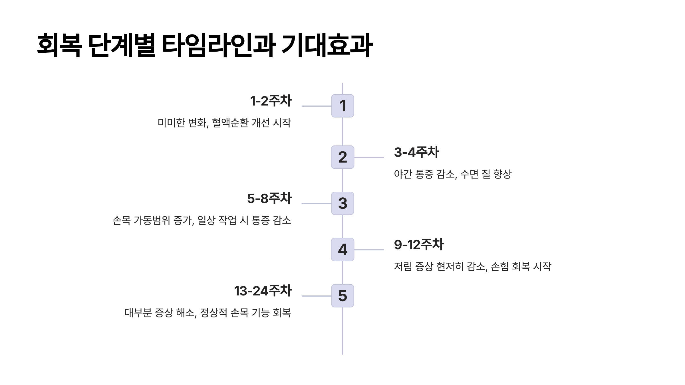 | 5-8주차 | 손목 가동범위 증가 | 일상 작업 시 통증 감소 | ★★★☆☆ |