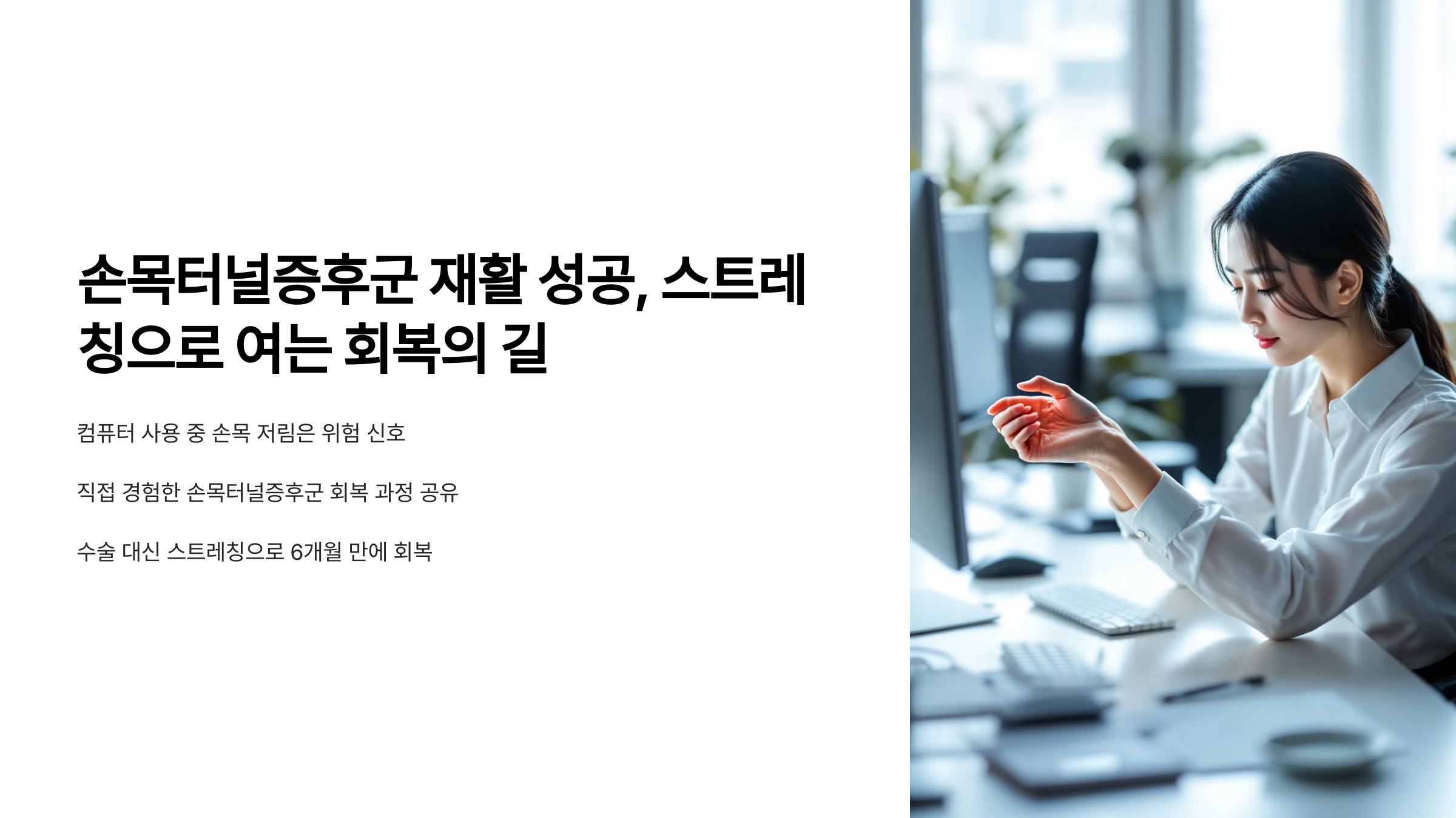 매일 컴퓨터 앞에서 시간을 보내는 당신, 손목이 저리고 아픈데 그냥 참고 계신가요? 더 이상 방치하면 수술까지 갈 수 있는 위험한 신호일지도 모릅니다.