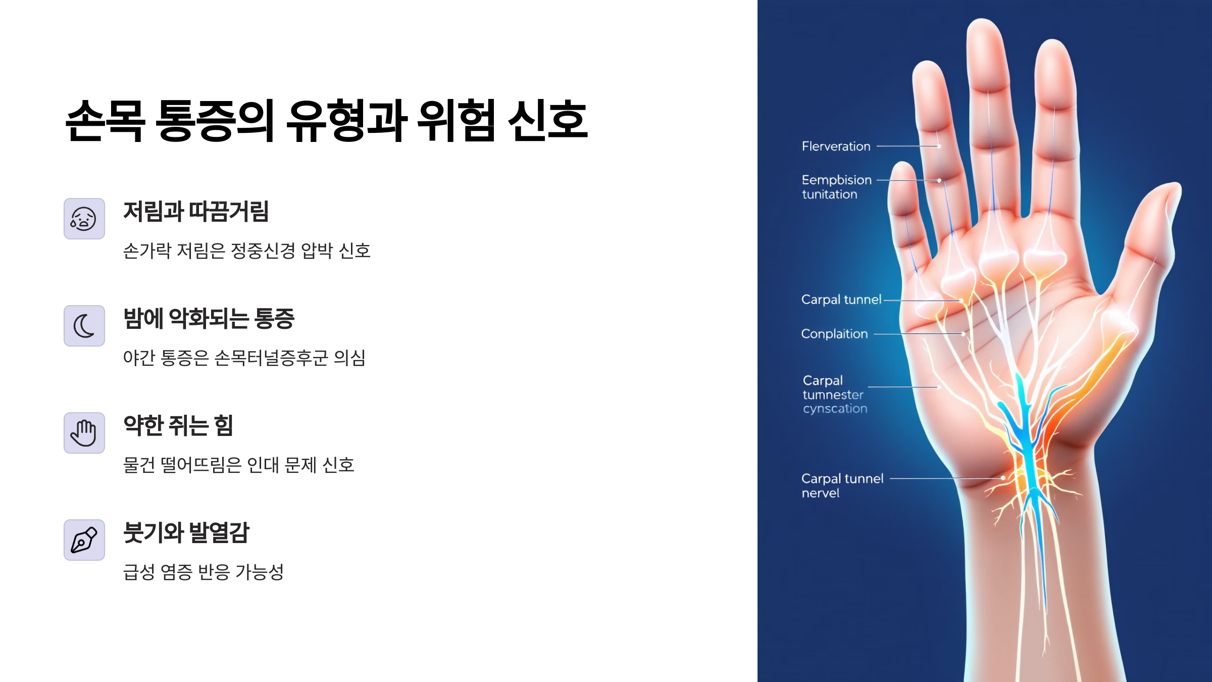 모든 손목 통증이 동일하게 생기는 것은 아니에요. 증상의 유형과 발생 시점에 따라 다양한 손목 질환을 의심해 볼 수 있습니다. 자신의 상태를 미리 확인하고 적절한 조치를 취하는 것이 중요해요.