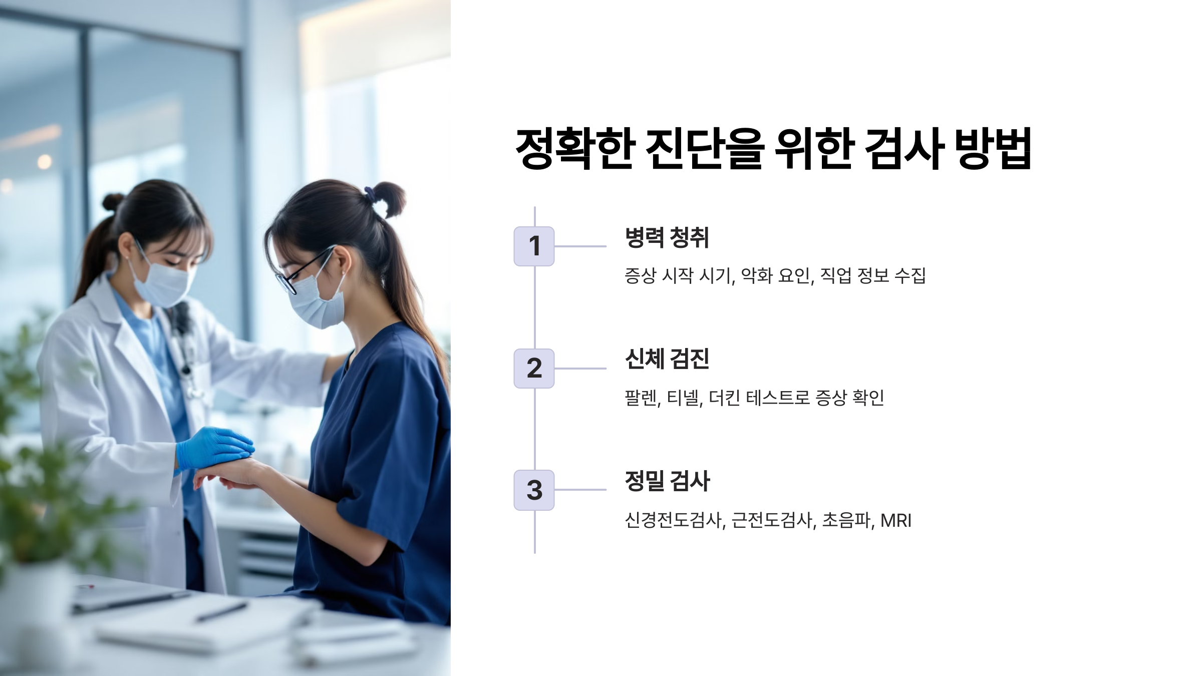 1. 병력 청취: 증상이 언제부터 시작됐는지, 어떤 활동을 할 때 악화되는지, 직업은 무엇인지 등 자세한 정보를 수집합니다. 예를 들어 저는 의사선생님께 "밤에 손이 저려서 깨고, 아침에 일어나면 손이 뻣뻣하다"고 말씀드렸더니 바로 손목터널증후군을 의심하시더라구요.