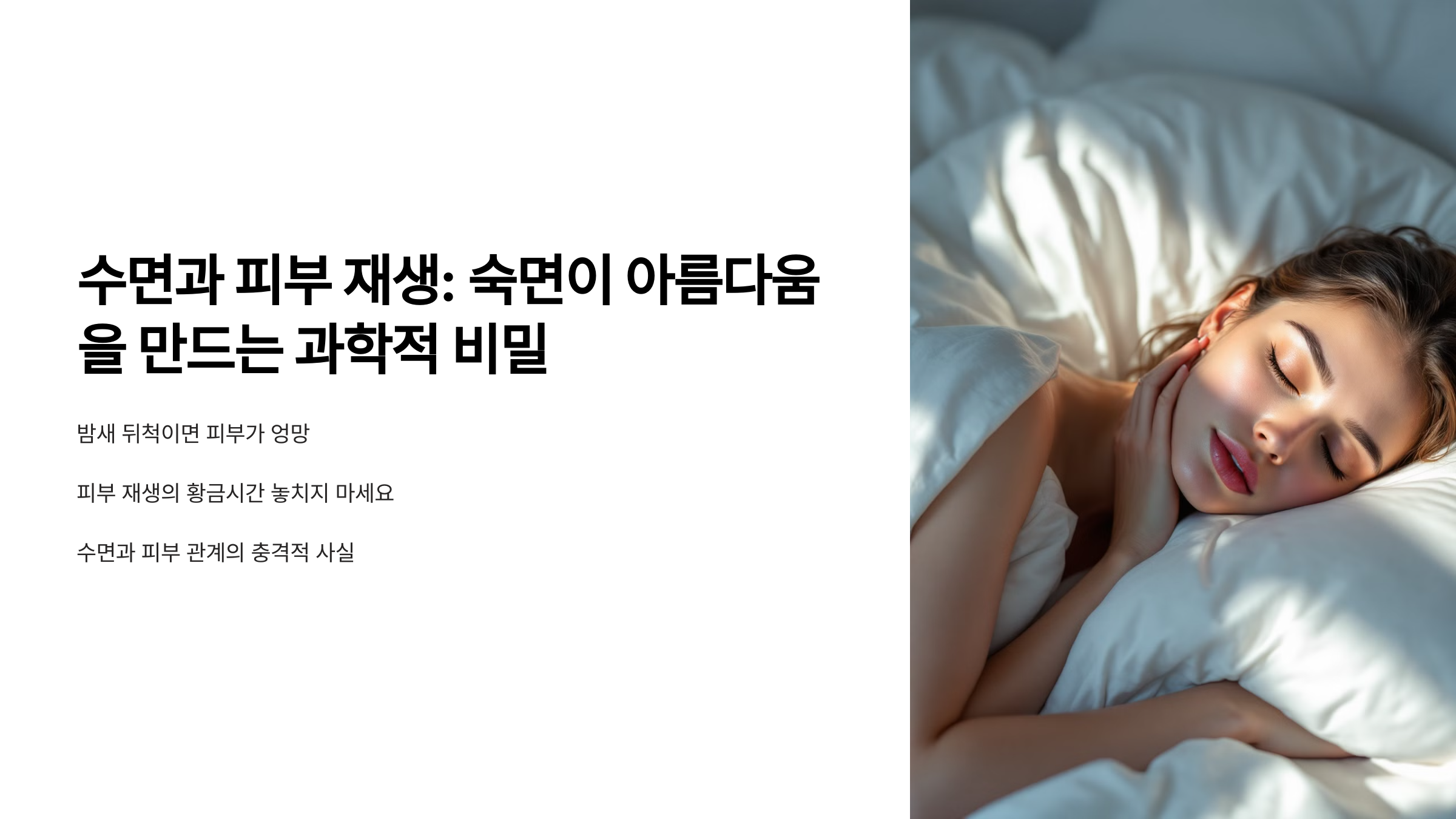안녕하세요, 여러분! 오늘은 제가 정말 관심 있는 주제에 대해 이야기해볼게요. 사실 저는 원래 밤늦게까지 일하는 올빼미형 인간이었어요. 그러다 30대 중반에 접어들면서 피부가 예전같지 않다는 걸 확 느꼈죠. 뭔가 달라져야겠다 싶어서 수면과 피부 관계에 대한 책과 논문을 읽어보기 시작했는데... 정말 충격적인 사실들을 알게 됐어요! 그래서 오늘은 제가 직접 경험하고 공부한 수면과 피부 재생에 관한 과학적 근거들을 총정리해서 알려드리려고 합니다.
