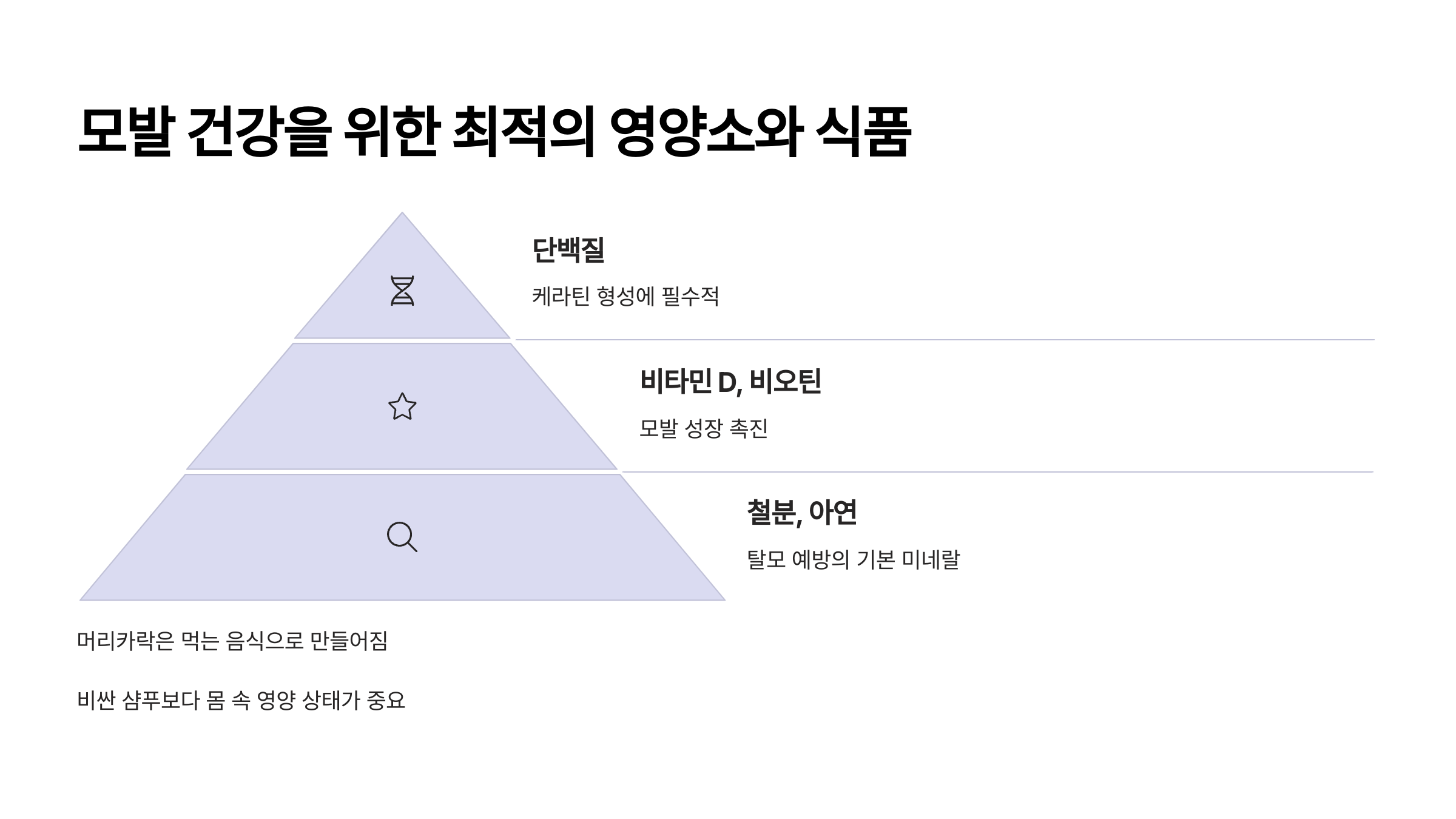 머리카락이 건강하게 자라려면 '안에서부터' 관리가 필요해요. 아무리 비싼 샴푸와 트리트먼트를 사용해도 몸 속 영양 상태가 좋지 않으면 효과가 제한적이거든요. 사실 우리 머리카락은 먹는 음식으로 만들어진다고 해도 과언이 아니에요.