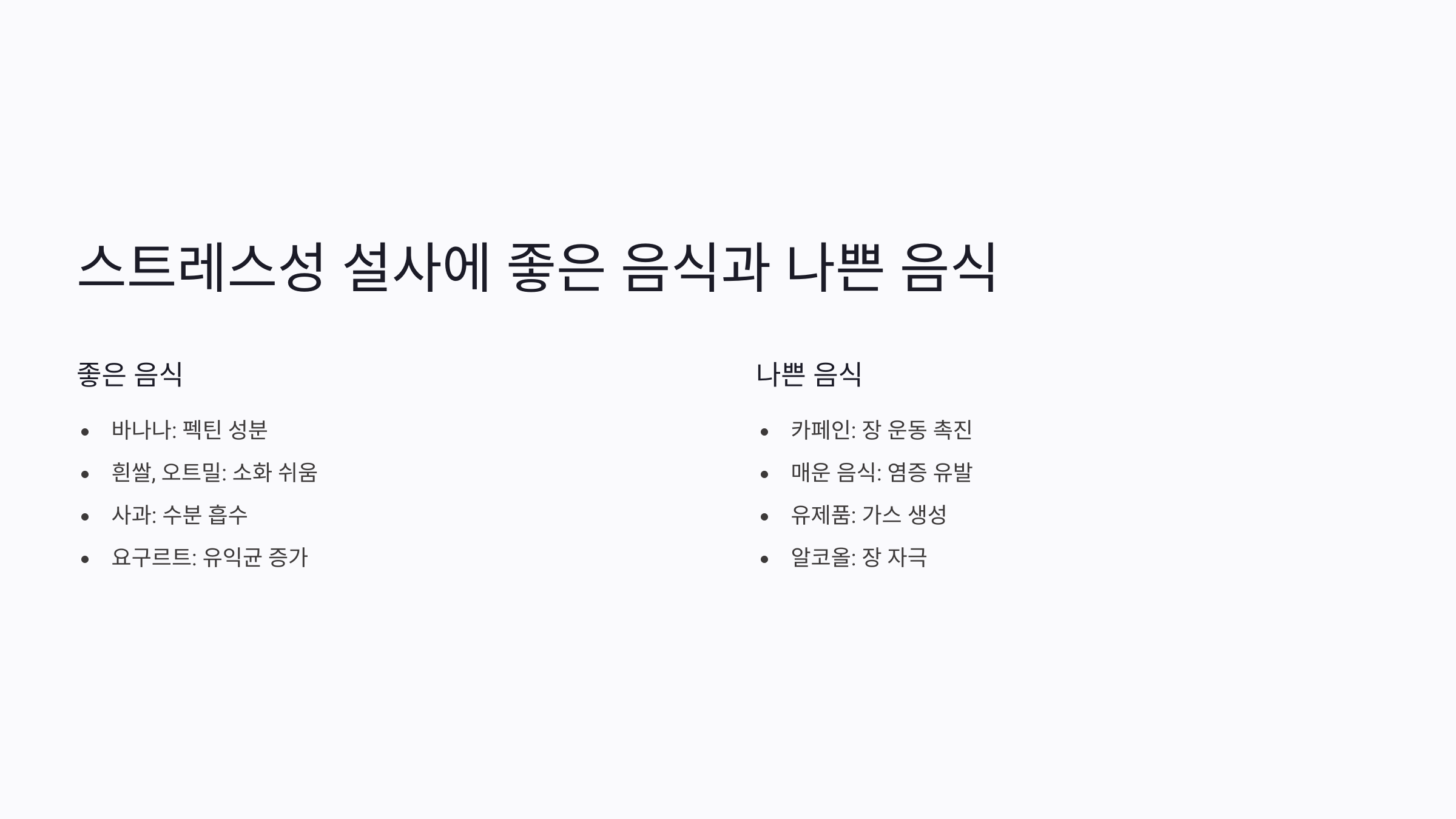 우리 사이에서만 말하자면, 음식 선택이 정말 중요해요. 적절한 식단 관리만으로도 스트레스성 설사의 80%는 예방할 수 있다고 해도 과언이 아니니까요. 그럼 자세히 알아볼까요?
