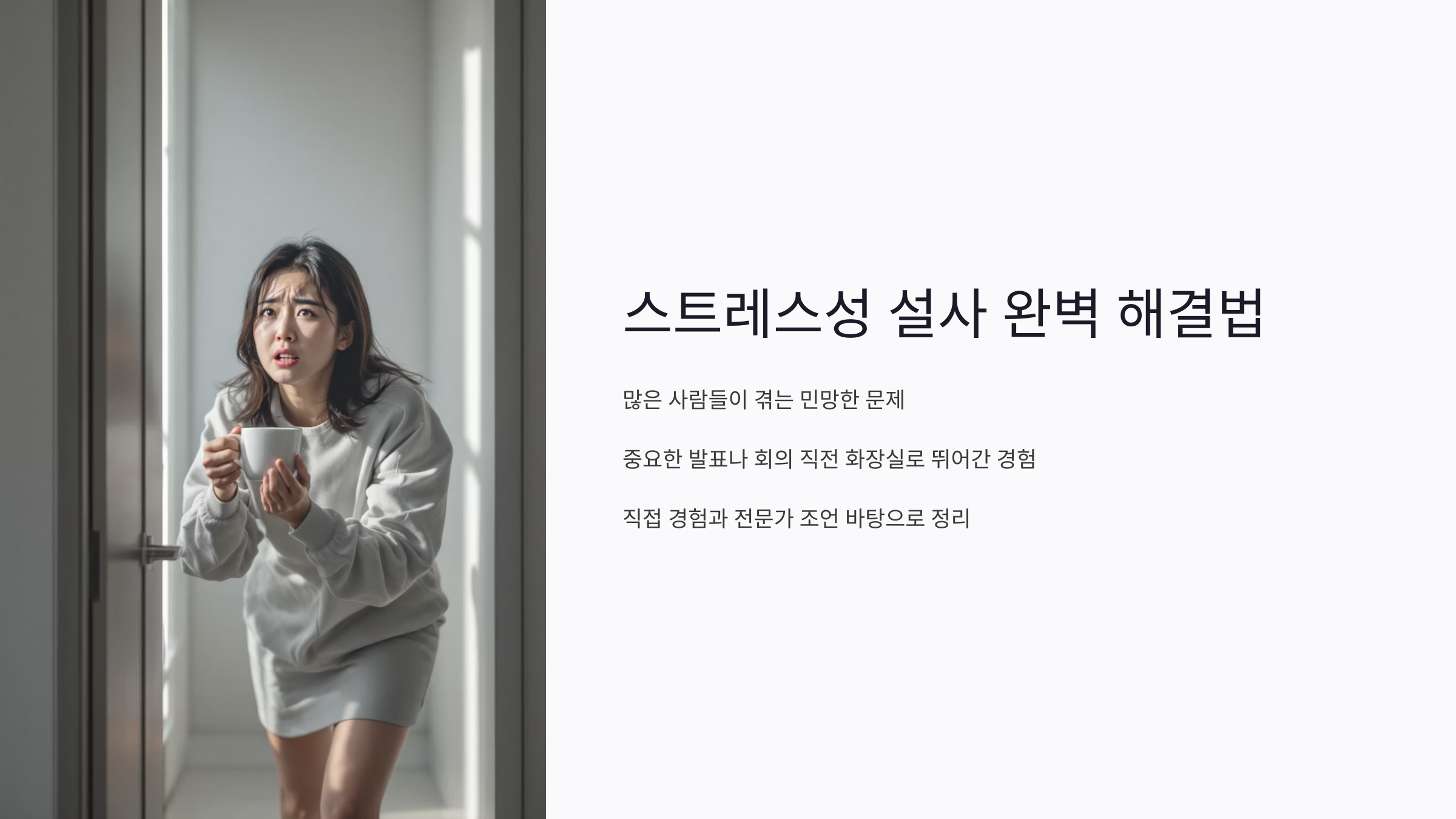 아침마다 화장실을 들락날락하는 당신, 혹시 중요한 발표나 회의 직전에 배가 아파 화장실로 뛰어간 경험 있으신가요?