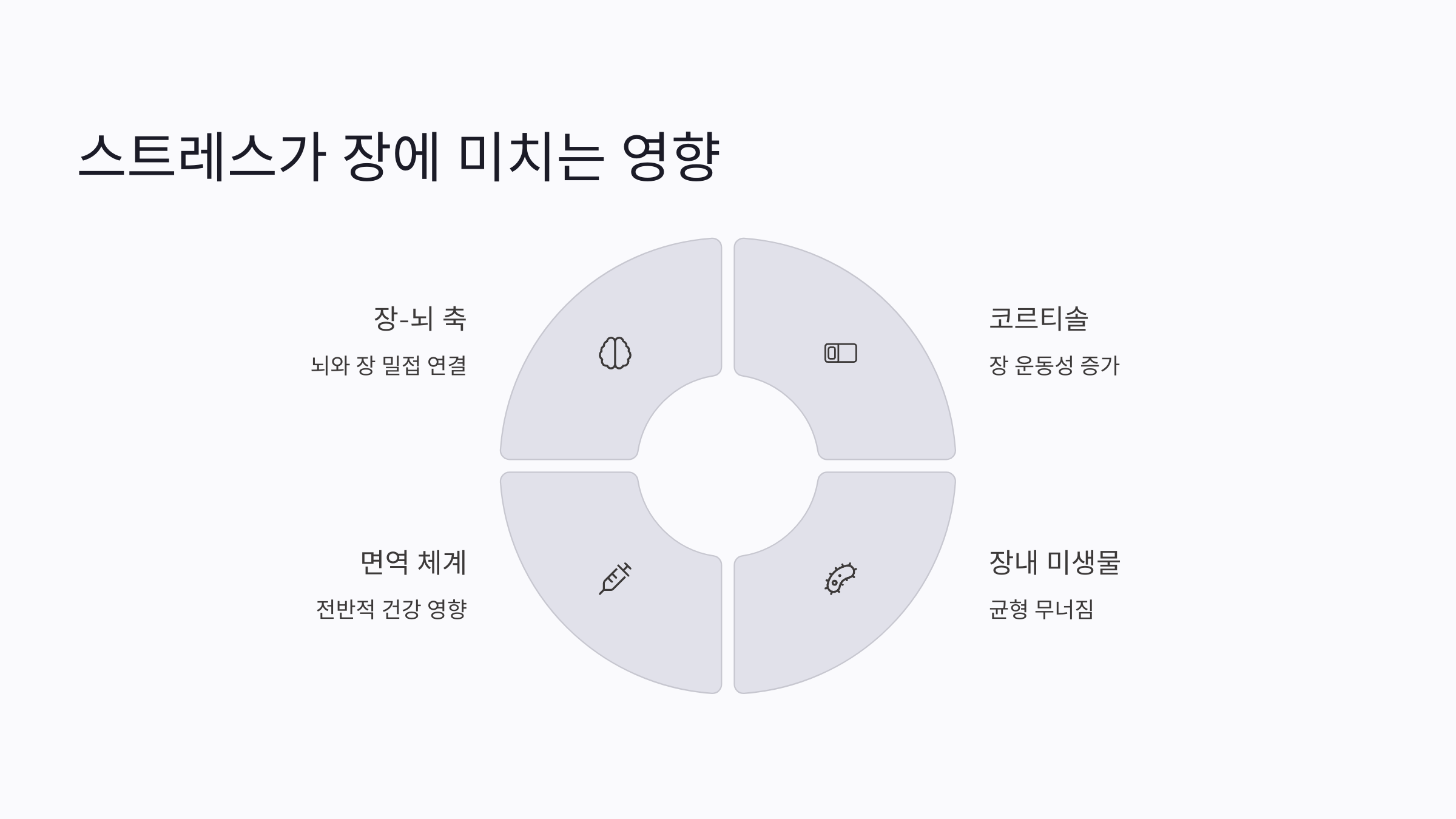 표에서 보시다시피, 스트레스는 여러 경로를 통해 우리 장에 영향을 미칩니다. 특히 중요한 것은 장기적인 스트레스가 장내 미생물 균형까지 무너뜨릴 수 있다는 점이에요. 요즘 핫한 '마이크로바이옴' 연구에 따르면, 장내 미생물 균형이 깨지면 면역 체계와 정신 건강에도 악영향을 미친다고 해요.