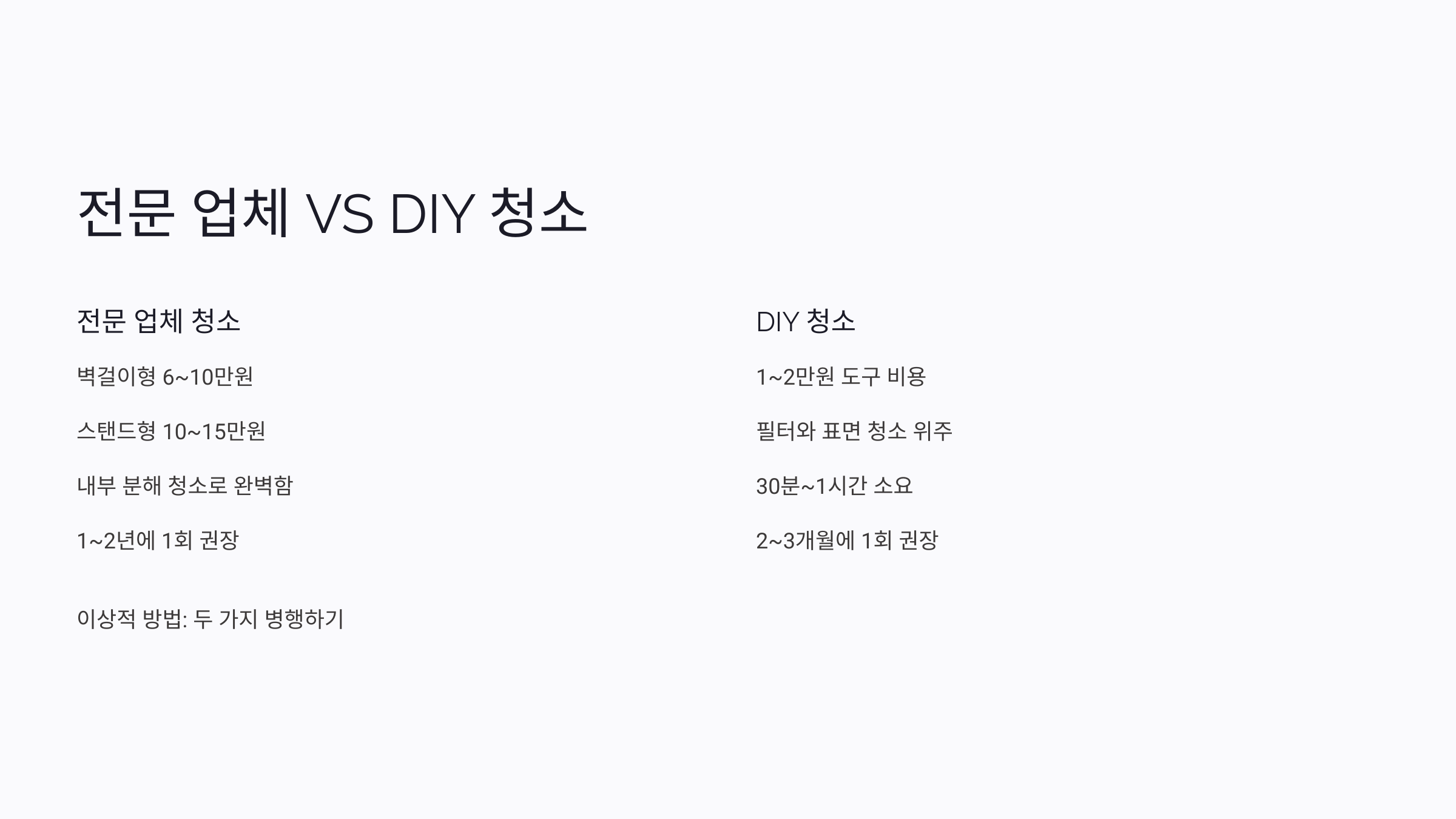 | 구분 | 전문 업체 청소 | DIY 청소 |