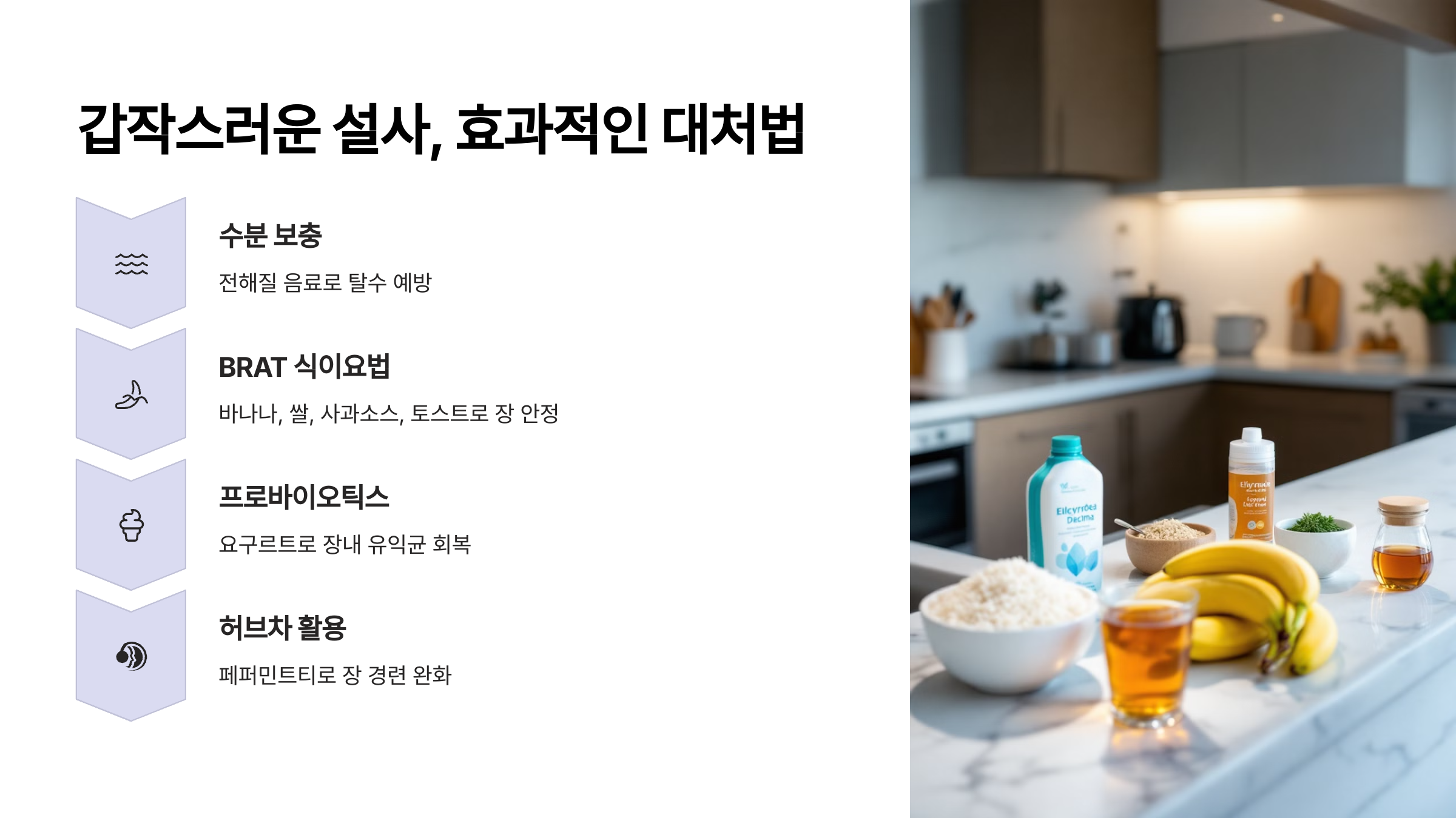 아무리 조심해도 가끔은 갑작스러운 설사를 경험할 수 있어요. 그럴 때 당황하지 않고 효과적으로 대처하는 방법을 알아두면 빠르게 회복하는 데 도움이 됩니다. 제가 직접 경험하고 도움을 받았던 방법들을 소개해 드릴게요.