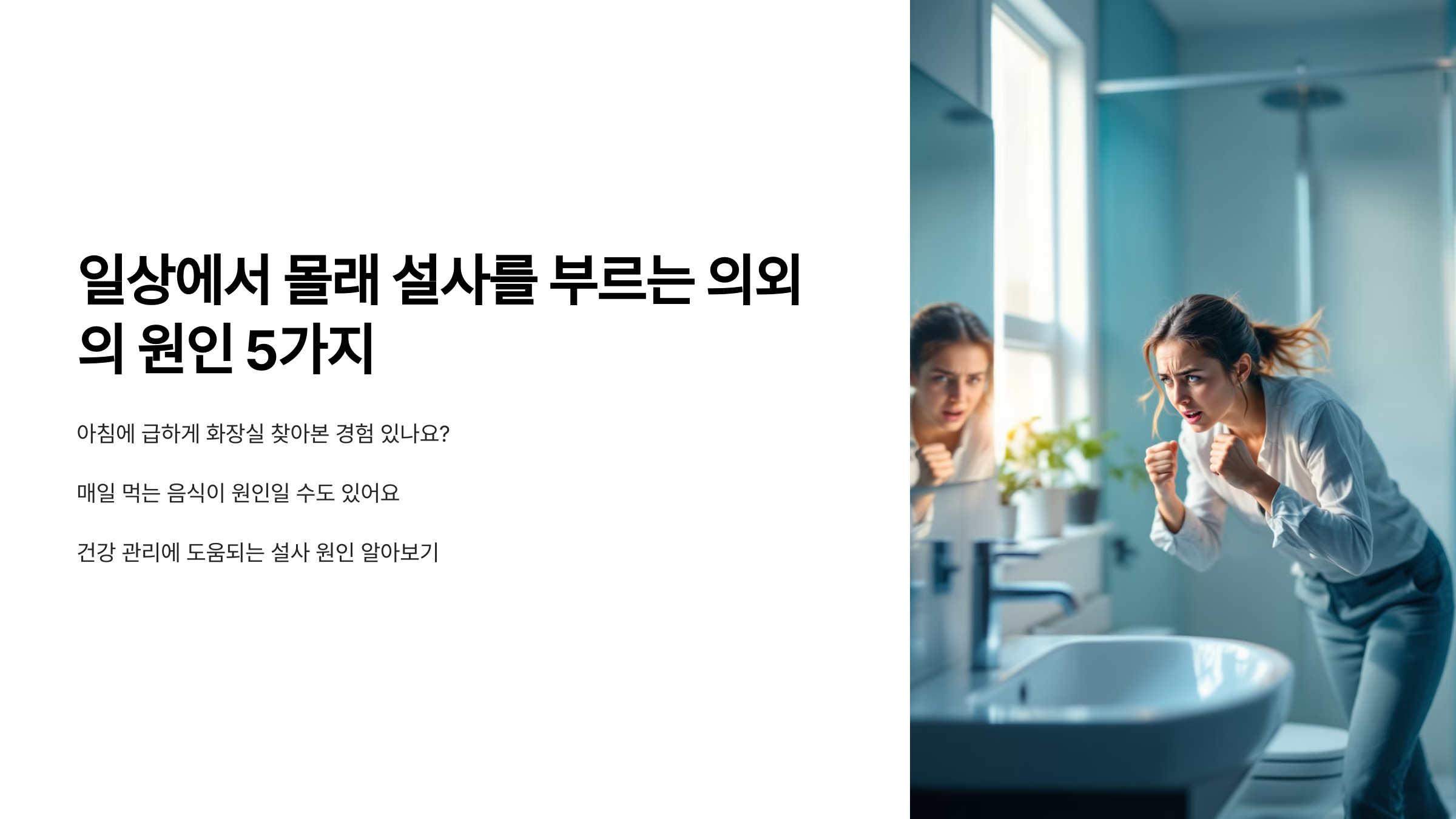 안녕하세요, 여러분! 오늘은 좀 민감하지만 누구나 한 번쯤 겪어봤을 설사 문제에 대해 솔직하게 이야기해보려고 해요. 사실 저도 지난주에 갑자기 배가 아파서 회의 중에 화장실로 뛰쳐나간 적이 있었어요. 알고보니 제가 매일 마시던 커피가 원인이었더라고요. 평소 잘 알지 못했던 설사의 의외 원인들을 알아두면 건강 관리에 정말 도움이 됩니다.