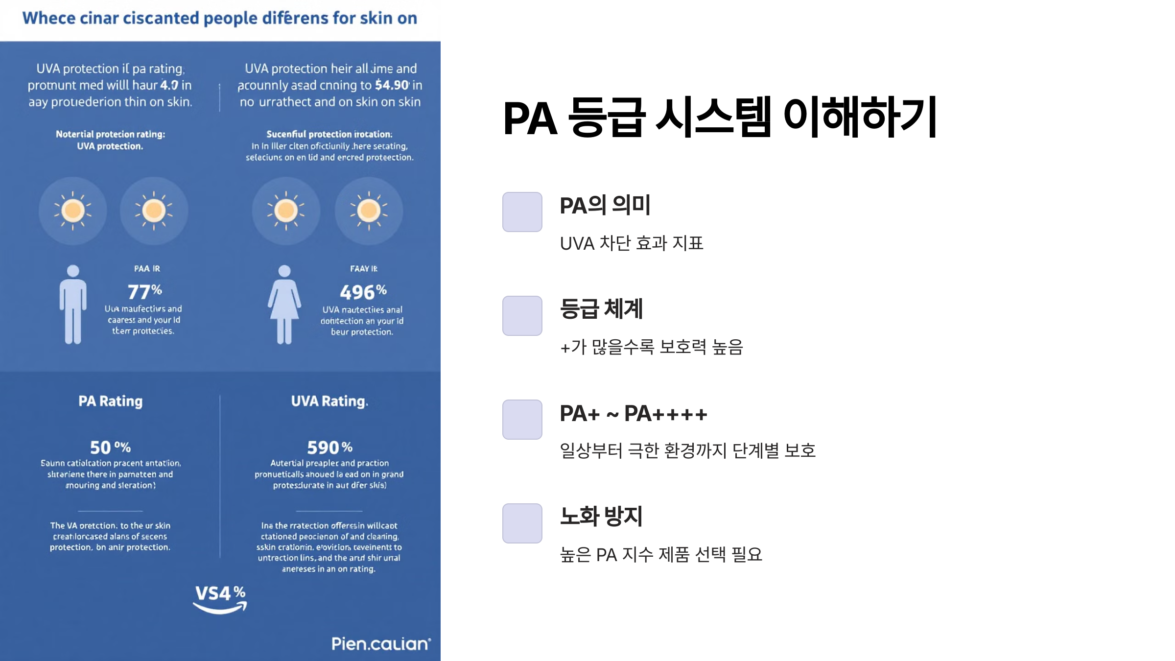 자, 이제 PA에 대해 알아볼 차례에요. PA는 'Protection Grade of UVA'의 약자로, UVA를 얼마나 효과적으로 차단하는지 보여주는 지표에요. 일본에서 개발된 이 시스템은 '+' 기호로 등급을 표시하는데, '+'가 많을수록 UVA 차단 효과가 높다는 뜻이에요.