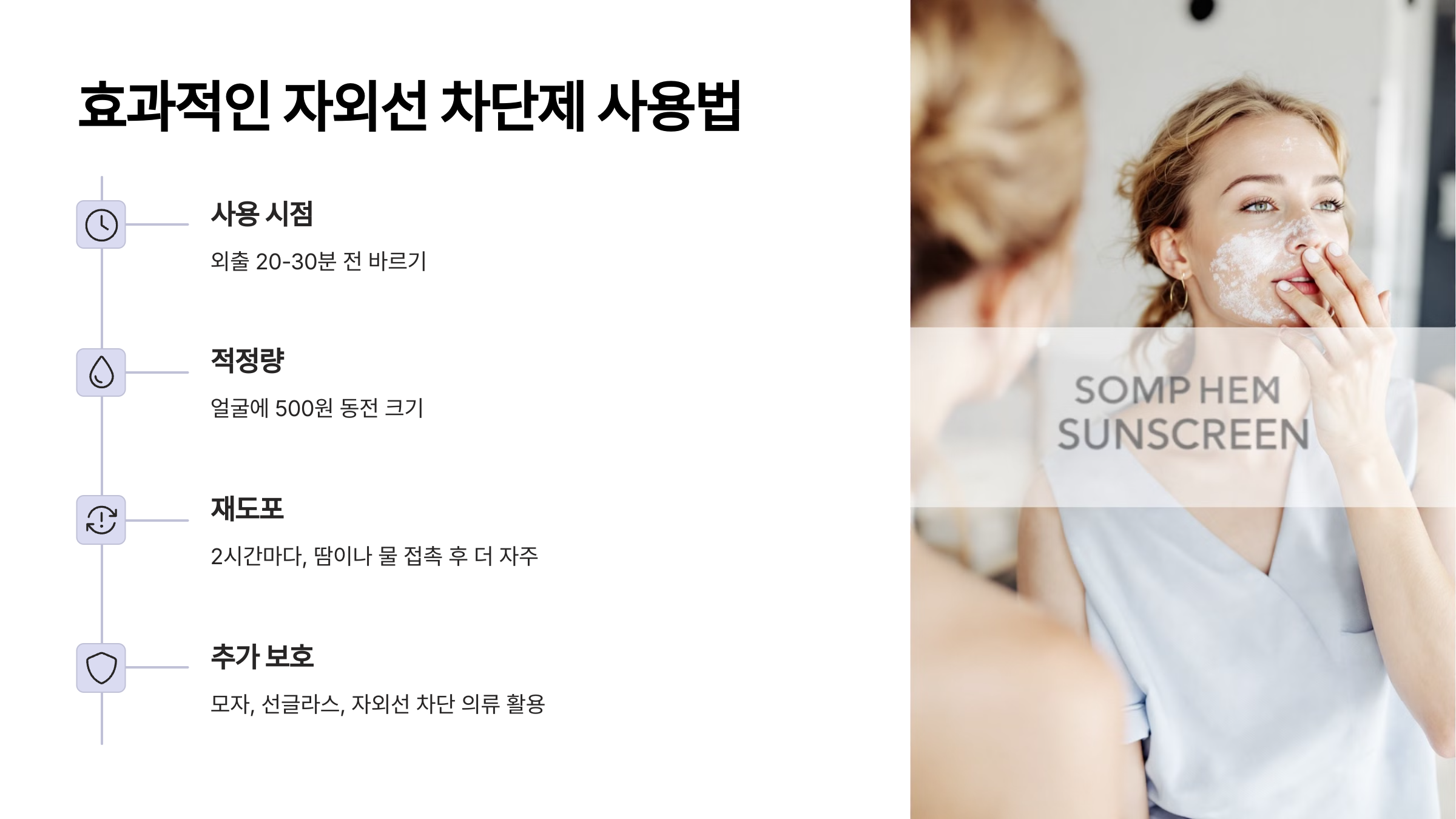 많은 사람들이 자외선 차단제 사용량을 너무 적게 바르는 실수를 해요. 얼굴 전체에 균일하게 바르려면 500원 동전 크기 정도의 양(약 1/4 티스푼)이 필요해요. 귀, 목, 디콜테 부분도 잊지 말고 발라주세요. 그리고 자외선 차단제는 2시간마다 재도포가 필요해요. 특히 땀을 흘리거나 물에 닿았다면 더 자주 발라야 합니다.