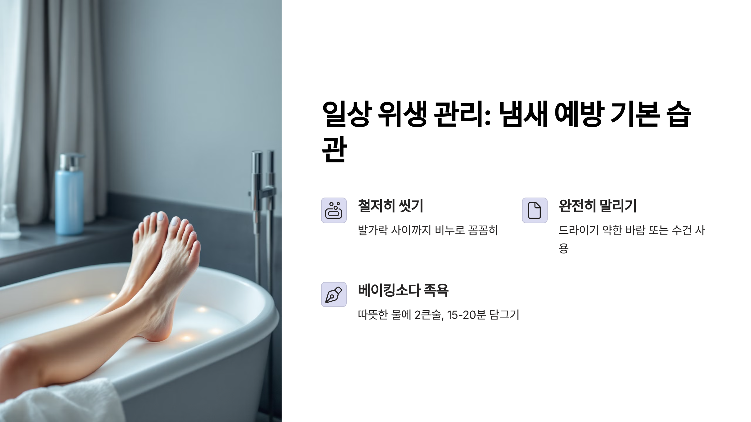 가장 기본은 매일 발을 철저히 씻는 것이에요. 그냥 물로 대충 헹구는 게 아니라, 발가락 사이사이까지 비누나 바디워시로 꼼꼼하게 씻어야 해요. 특히 발가락 사이는 습기가 남기 쉬워서 박테리아가 번식하기 딱 좋은 환경이 된답니다.