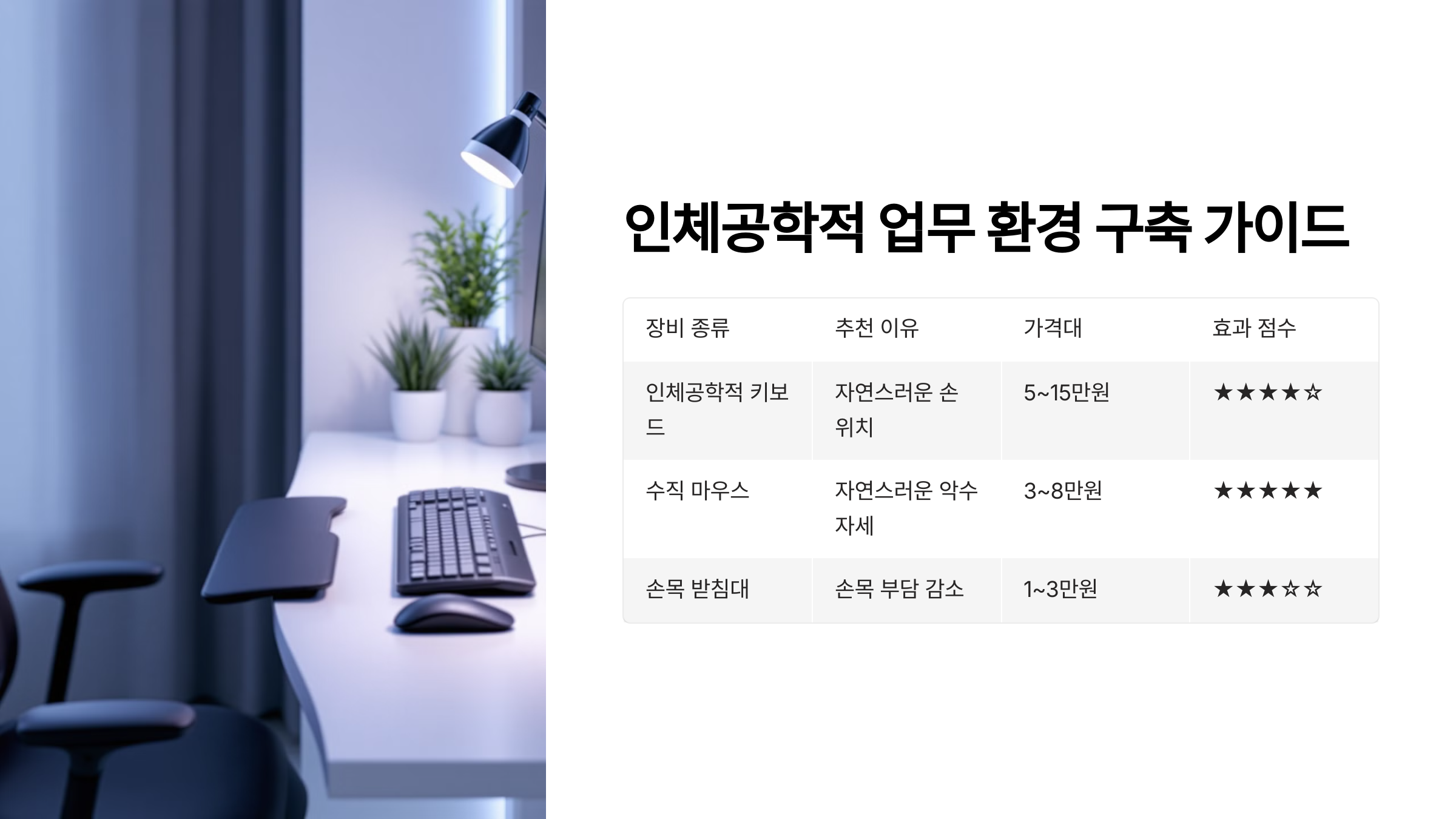 여러분의 업무 환경이 손목 건강에 얼마나 중요한지 아세요? 제가 손목터널증후군 초기 증상을 겪었을 때, 의사가 가장 먼저 물어본 게 제 작업 환경이었어요. 그리고 몇 가지 조언을 받아 환경을 바꾸었더니 정말 큰 차이를 느꼈어요!