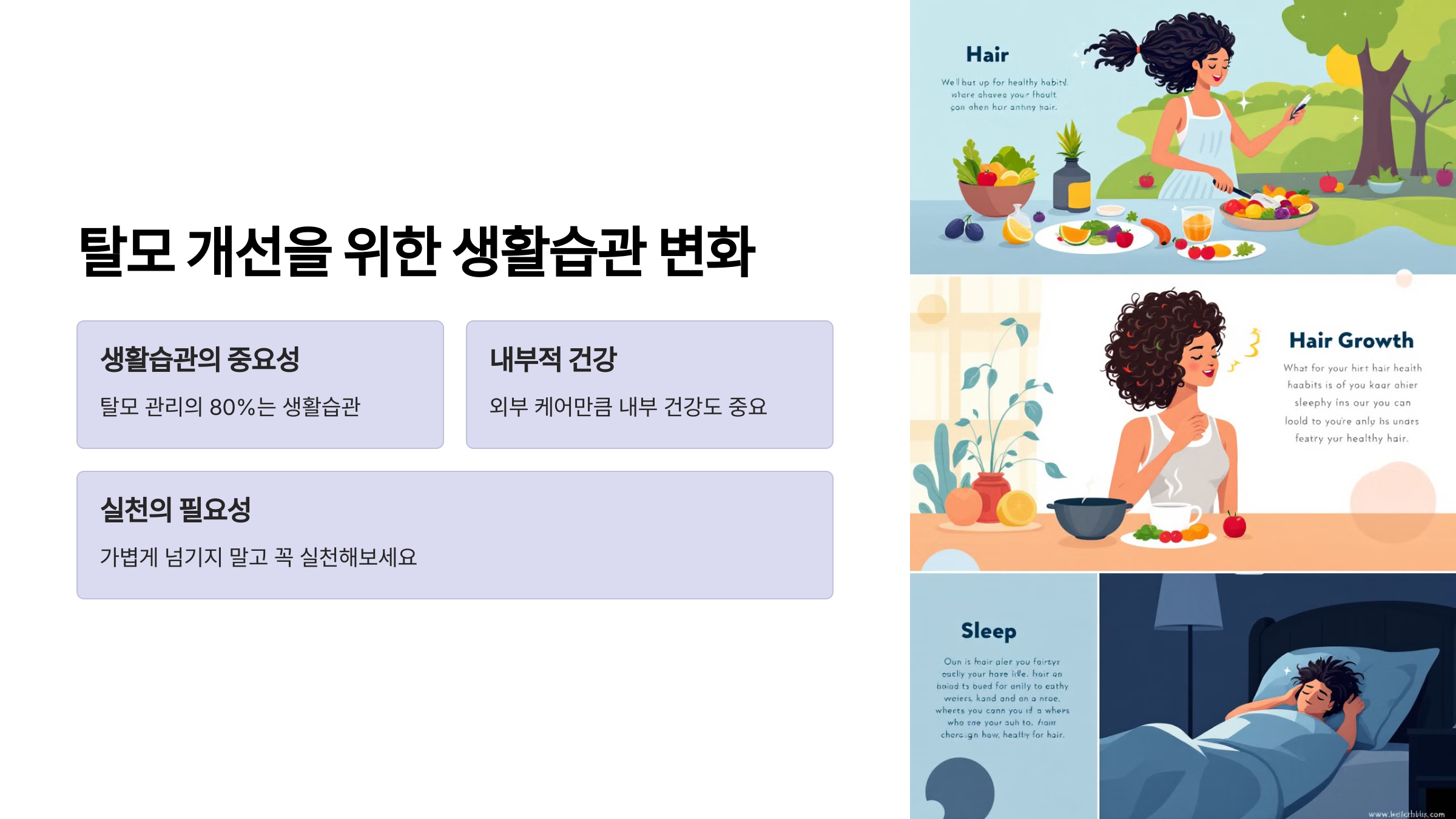 탈모 관리의 80%는 생활습관에서 시작된다고 해도 과언이 아니에요! 그러니 이 부분을 정말 가볍게 넘기지 마시고 꼭 실천해보세요.