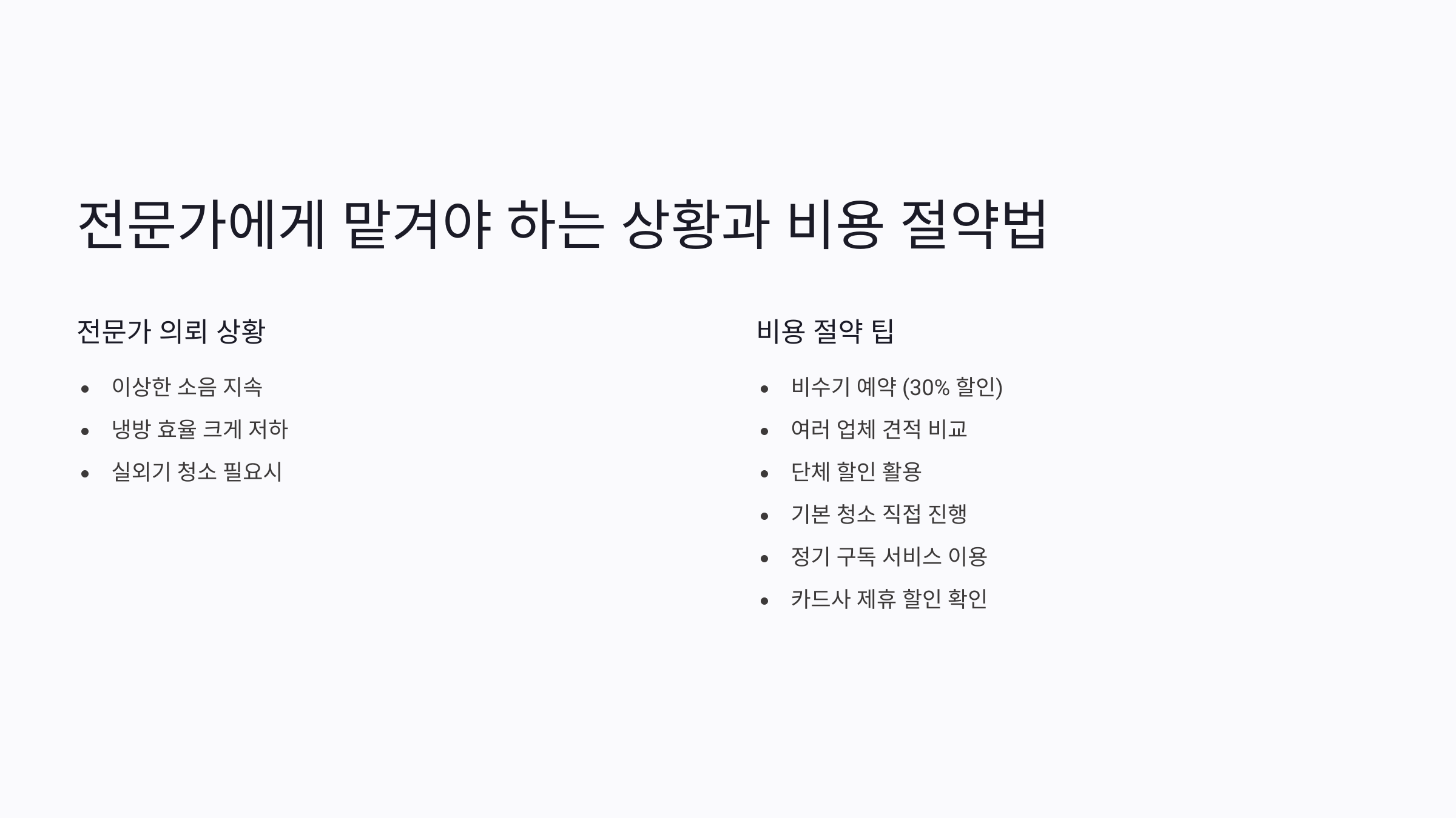 • 기본 청소는 직접 하기: 전문가를 부르기 전에 필터와 외관은 직접 청소해두세요. 그럼 전문가는 내부 청소에만 집중할 수 있어 시간이 단축되고, 추가 비용을 절약할 수 있어요.